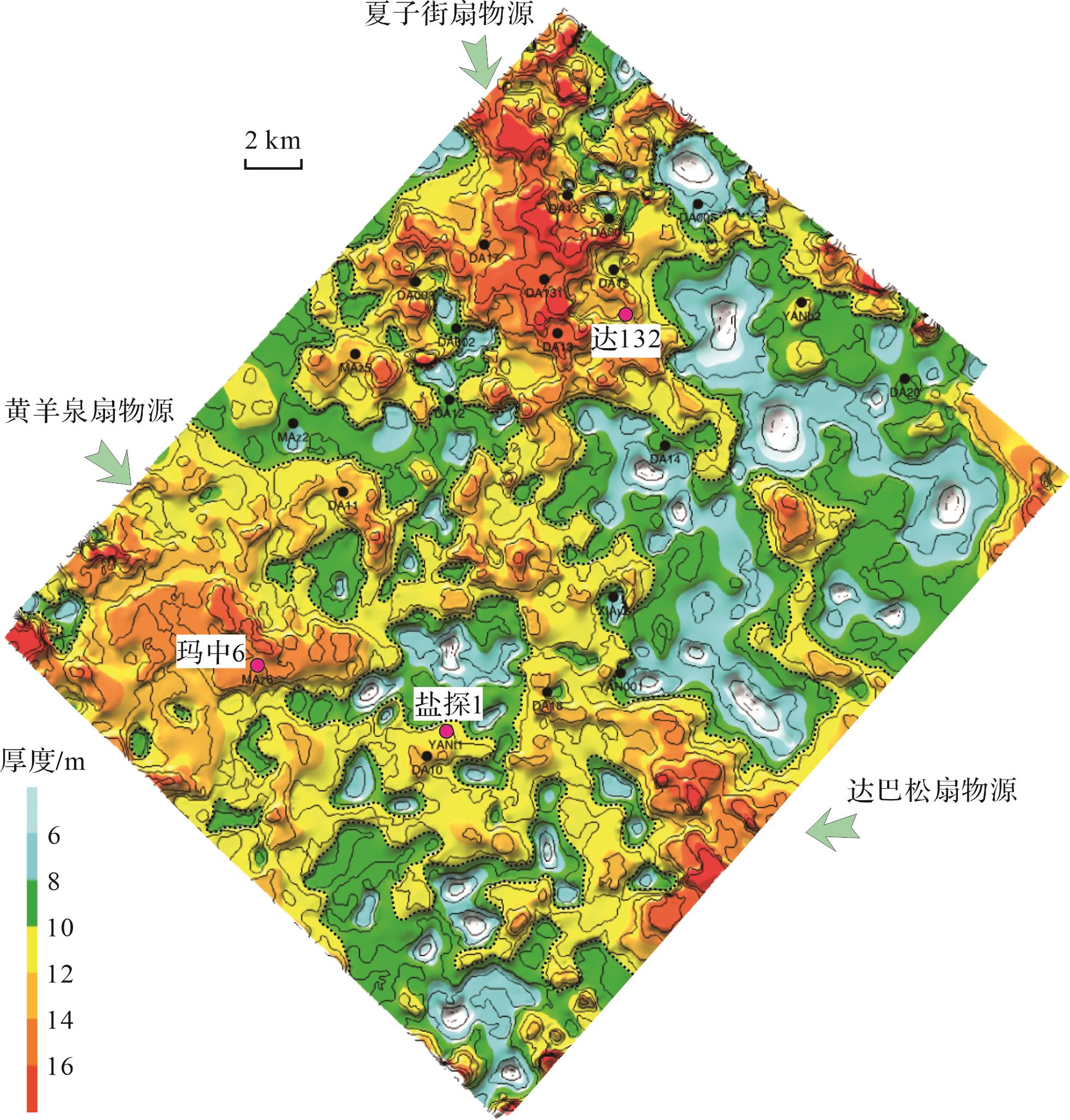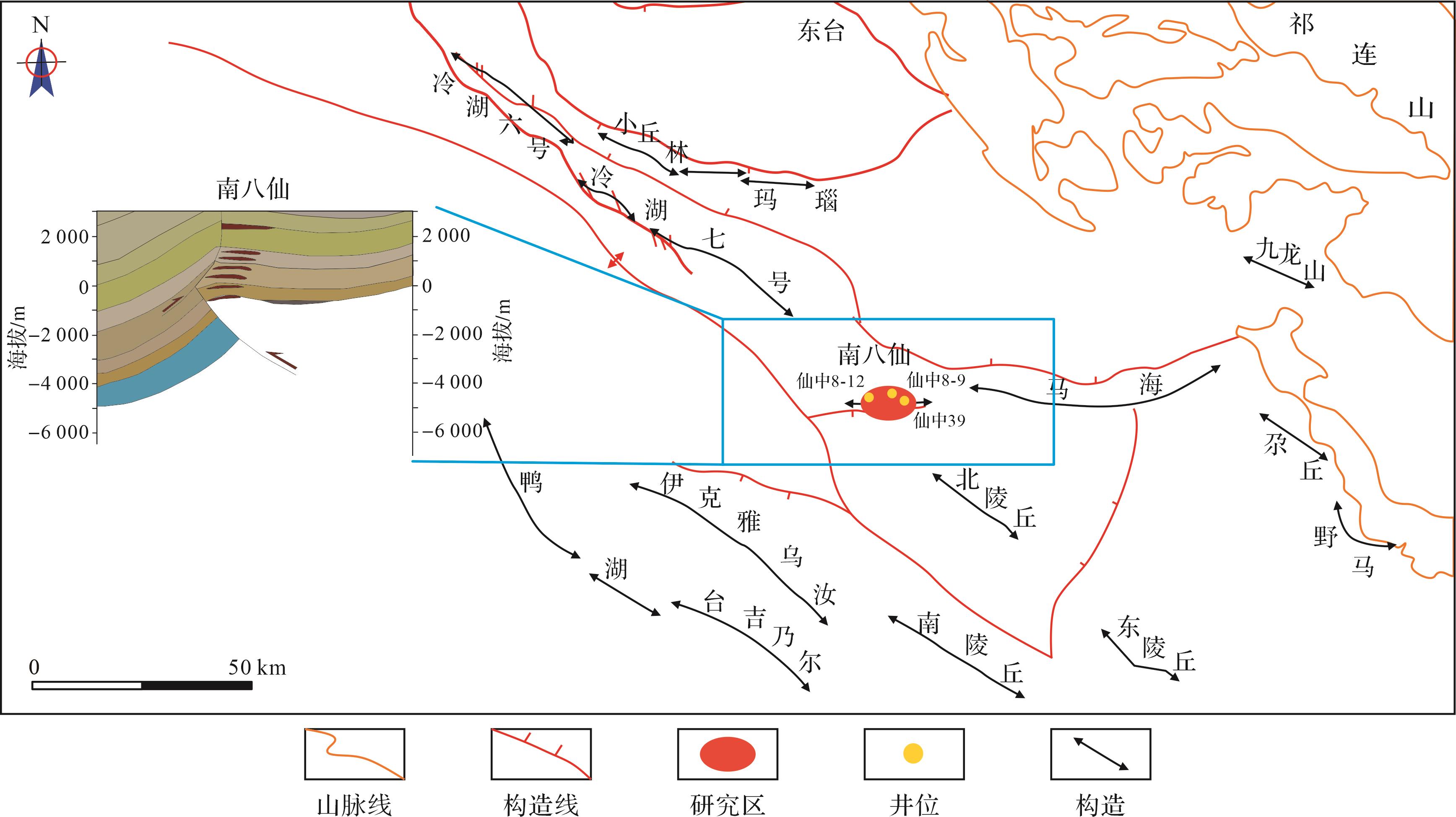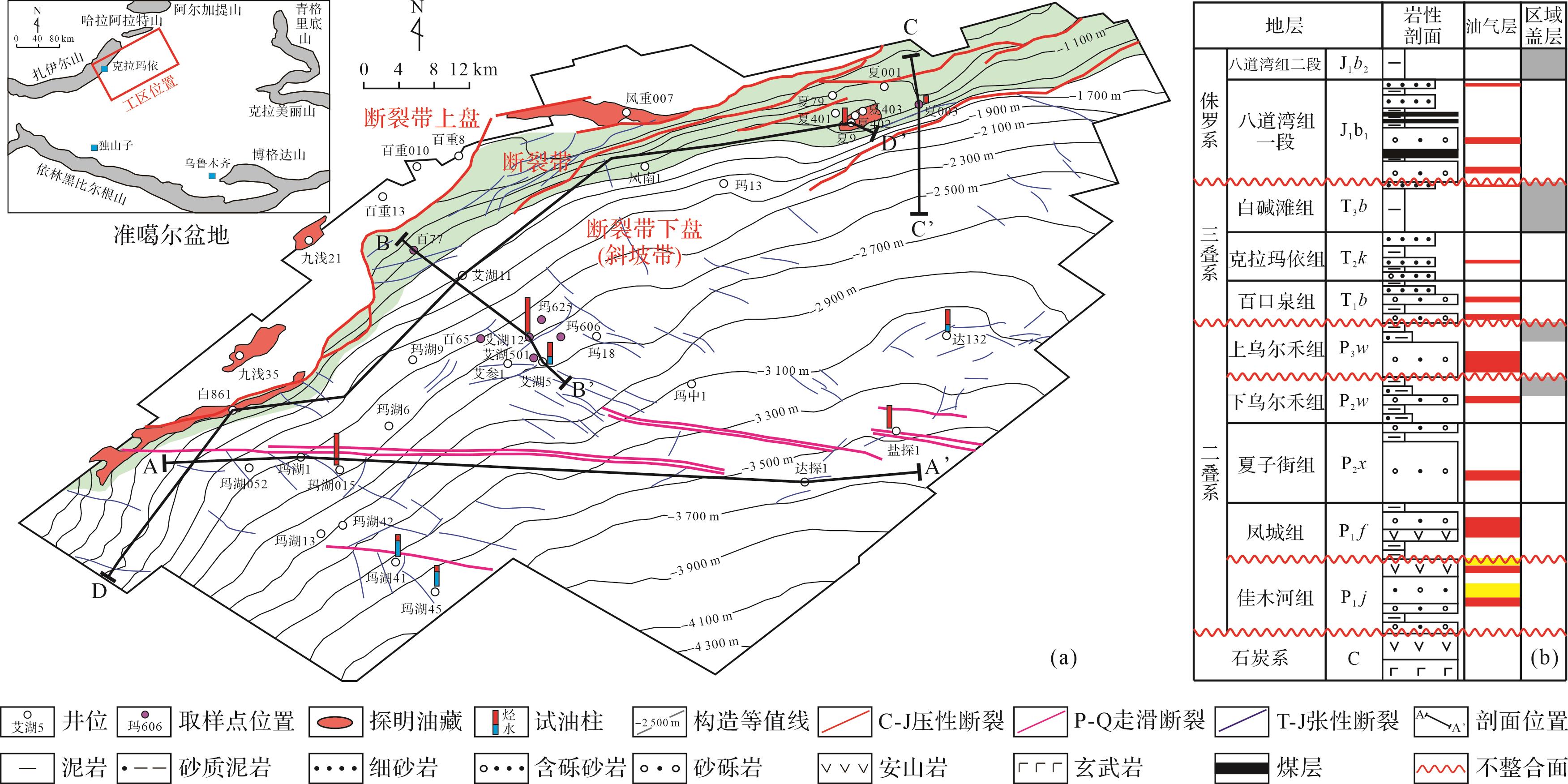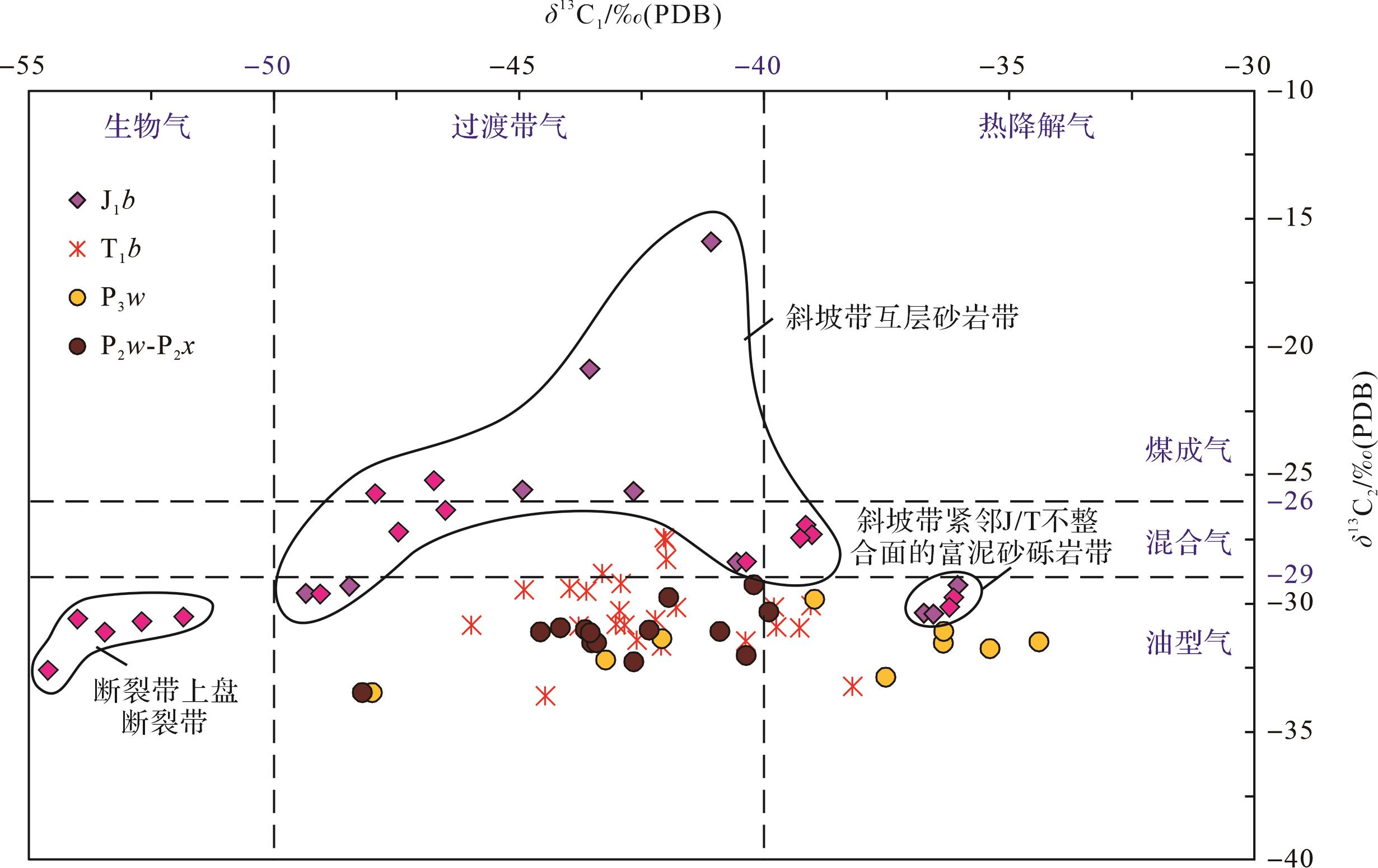 目的 准噶尔盆地玛湖斜坡区侏罗系八道湾组一段(J1b1)为紧邻J/T不整合面之上的一套含煤岩系砂(砾)岩沉积。内部油气性质垂向差异较大,靠近J/T不整合面的底部富泥砂砾岩带油气稠化现象明显,轻质油气主要富集在煤层之上的互层砂岩带内。在相对深埋区油气稠化带成因、大气淡水对不整合面上覆地层的渗滤机制、含煤岩系煤层之上轻质油气富集的成因研究等方面尚缺乏系统研究。 方法 基于原油性质及天然气碳同位素分析,结合埋藏史—热史—孔隙演化及含烃盐水包裹体激光拉曼光谱特征分析等数据,探讨J1b1天然气成因类型及油气稠化带、轻质油气带成因及展布规律。 结果 (1)J1b1含煤岩系按照油气密度黏度特征可分为油气稠化带、轻质油气带;前者主要分布于断裂带上盘、断裂带及斜坡带紧邻J/T不整合面的底部富泥砂砾岩带,后者主要分布于斜坡带煤层之上的互层砂岩带,且煤成气含量较高;(2)“燕山期正断裂—J/T不整合面—富泥砂砾岩组合”及伴生的润湿水相的毛细管自吸作用,导致在埋藏相对较深的斜坡区形成与不整合面密切相关的大气淡水压实—离心流油气稠化带;(3)煤层之上的互层砂岩油气藏具有“自生自储(J1b1煤层解吸气充注)”及“下生上储(二叠系风城组烃源岩供烃)”混源油气充注特征,具有轻质油气富集优势。 结论 J1b1上部互层砂岩带是轻质油气富集带勘探的首选领域,建立“CNL-IMP联合约束”含煤岩系岩性测井定量识别图版。针对J1b1上部互层砂岩轻质油气储集带,在盐探1三维地震区内识别出厚度大于10 m的互层砂岩有效储层(中细砂岩+粗中砂岩+含砾粗砂岩)分布区68.4 km2。