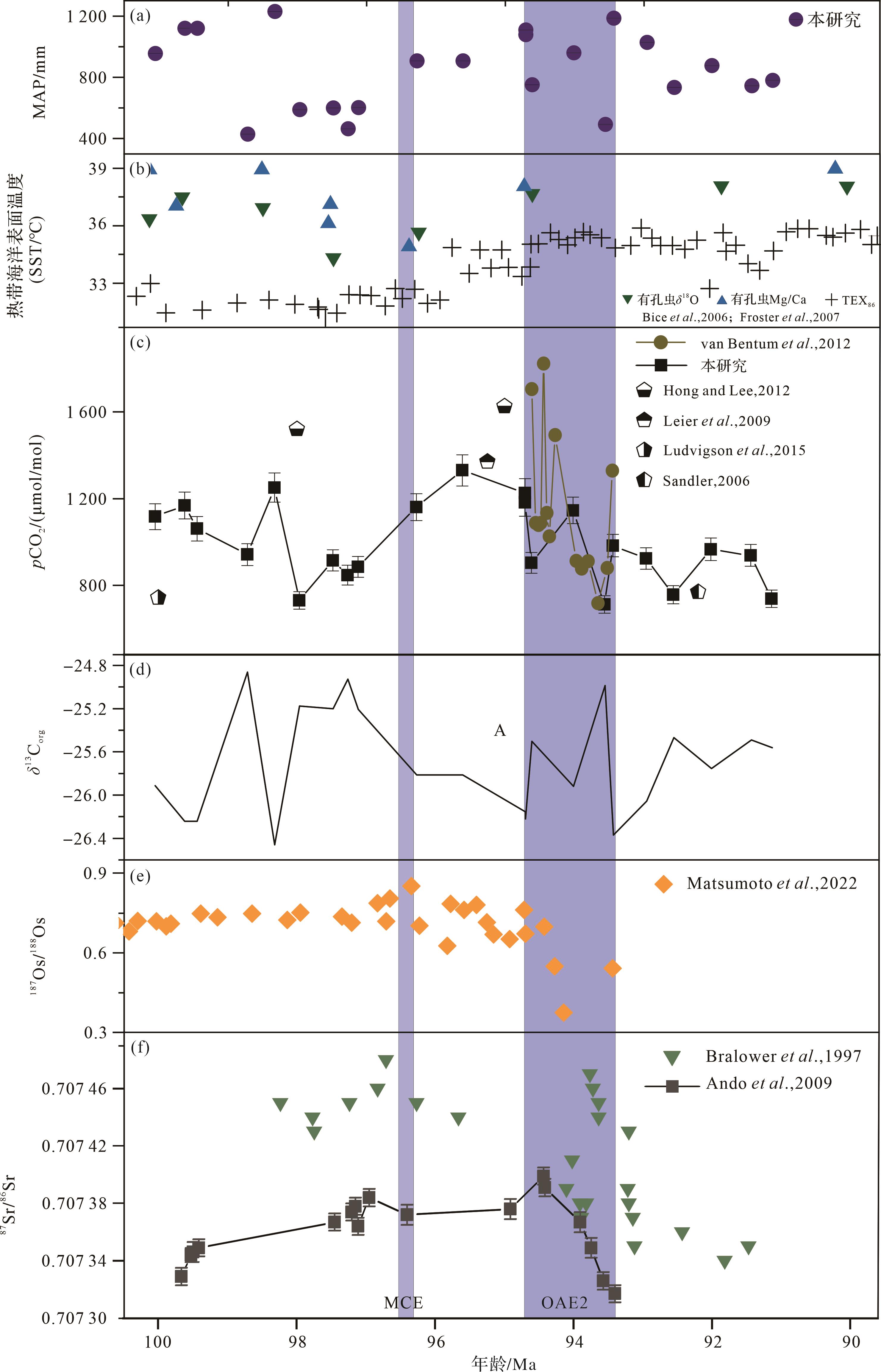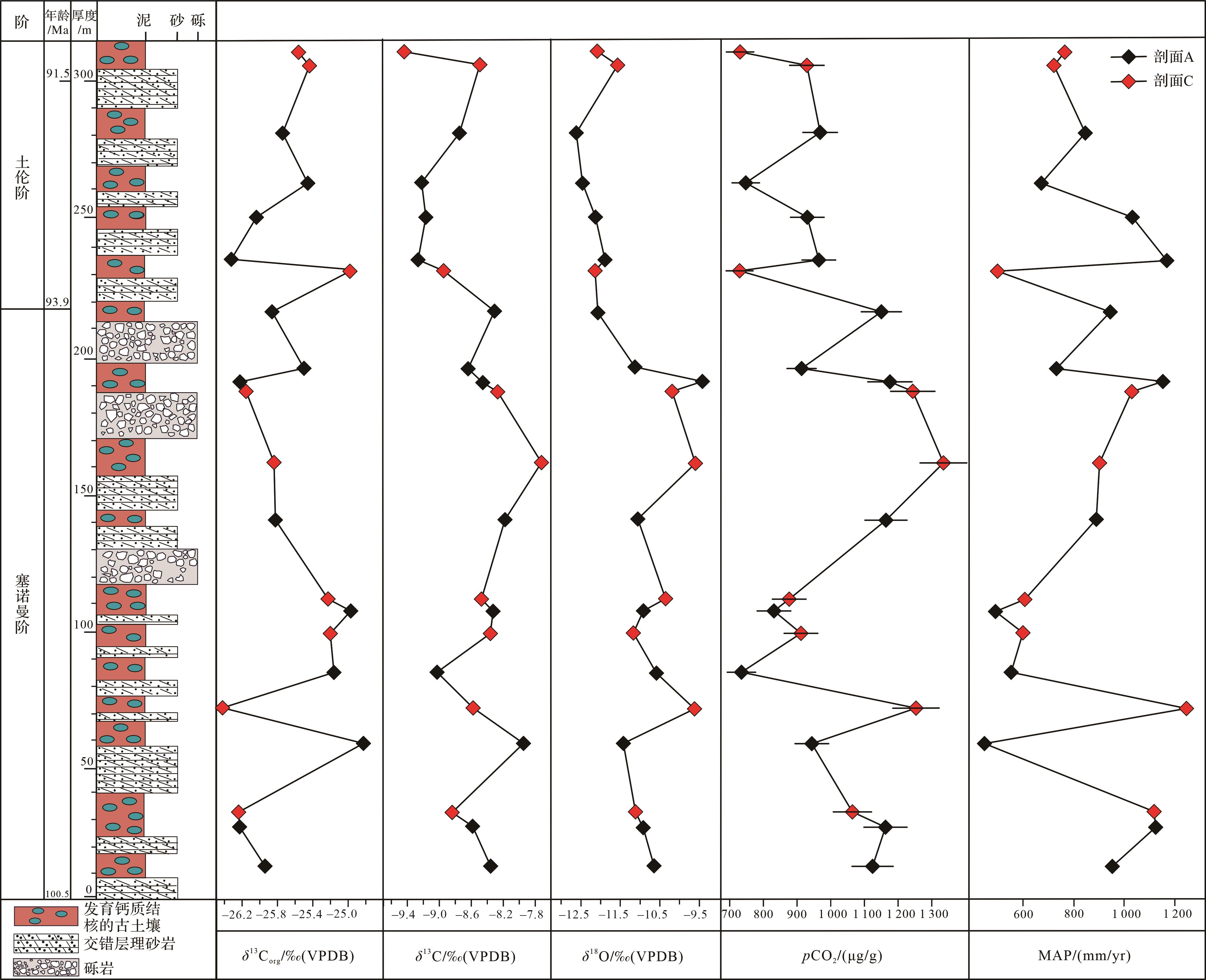 目的 长期以来,对白垩纪塞诺曼期—土伦期(C-T,100.5~89.8 Ma)大气二氧化碳浓度(pCO2)的重建仅限于阶段尺度的时间分辨率(即时间分辨率仅停留在塞诺曼期或土伦期的pCO2重建),且有关这一时期的研究大多基于海相地层,这对于理解C-T极端温室气候和全球碳循环扰动的效用非常有限。 方法 为了加深对C-T极端温室气候期间pCO2波动及其古气候响应的理解,本研究通过分析西藏东南部昌都盆地南新组钙质结核的稳定同位素重建了C-T时期高分辨率的大气pCO2和平均年降水量(MAP)。 结果 pCO2在早塞诺曼期逐渐减少,而在中晚塞诺曼期逐渐增加,到早中土伦期,pCO2存在明显波动。除 pCO2的长期波动外,南新组古土壤钙质结核还记录了塞诺曼期发生的碳循环扰动事件,即大洋缺氧事件2(OAE2)。在OAE2期间,存在两个不同的CO2脉冲,且pCO2的极大(小)值点与δ13Corg的极小(大)值点相对应。pCO2在OAE2边界处上升至1 300 μmol/mol,随后OAE2期间大规模有机碳埋藏导致pCO2下降了约17%。中晚塞诺曼期持续增加的二氧化碳浓度可能加剧了温室气候并驱动大气湿度的增加,这导致有机碳同位素的显著负偏移并使其与无机碳同位素解耦。 结论 通过对C-T时期古MAP敏感性的估计得出:大气二氧化碳浓度从500 μmol/mol增加到1 000 μmol/mol时,MAP增加511 mm。