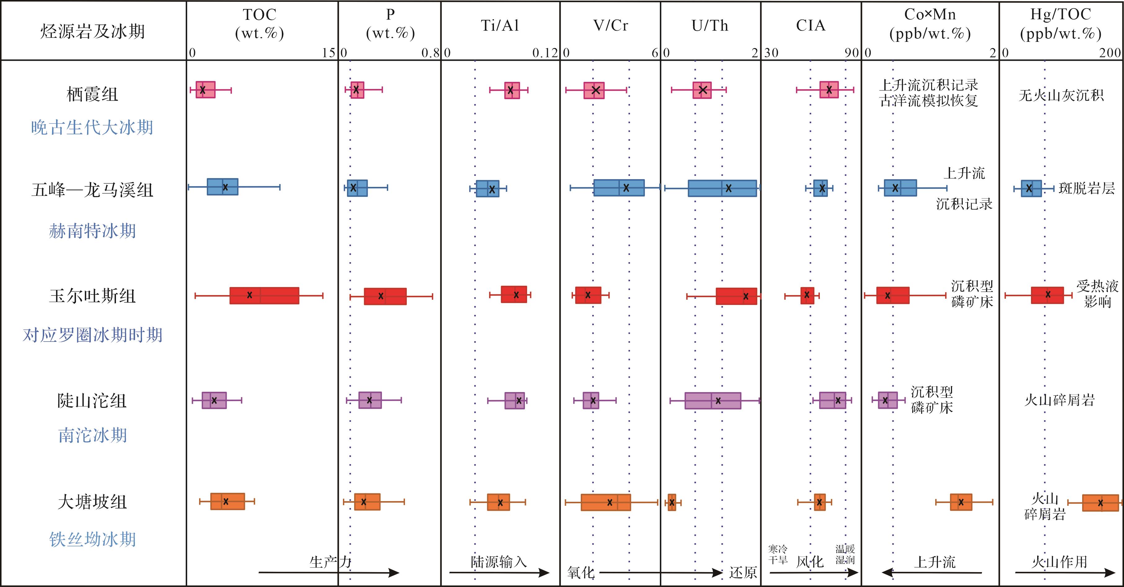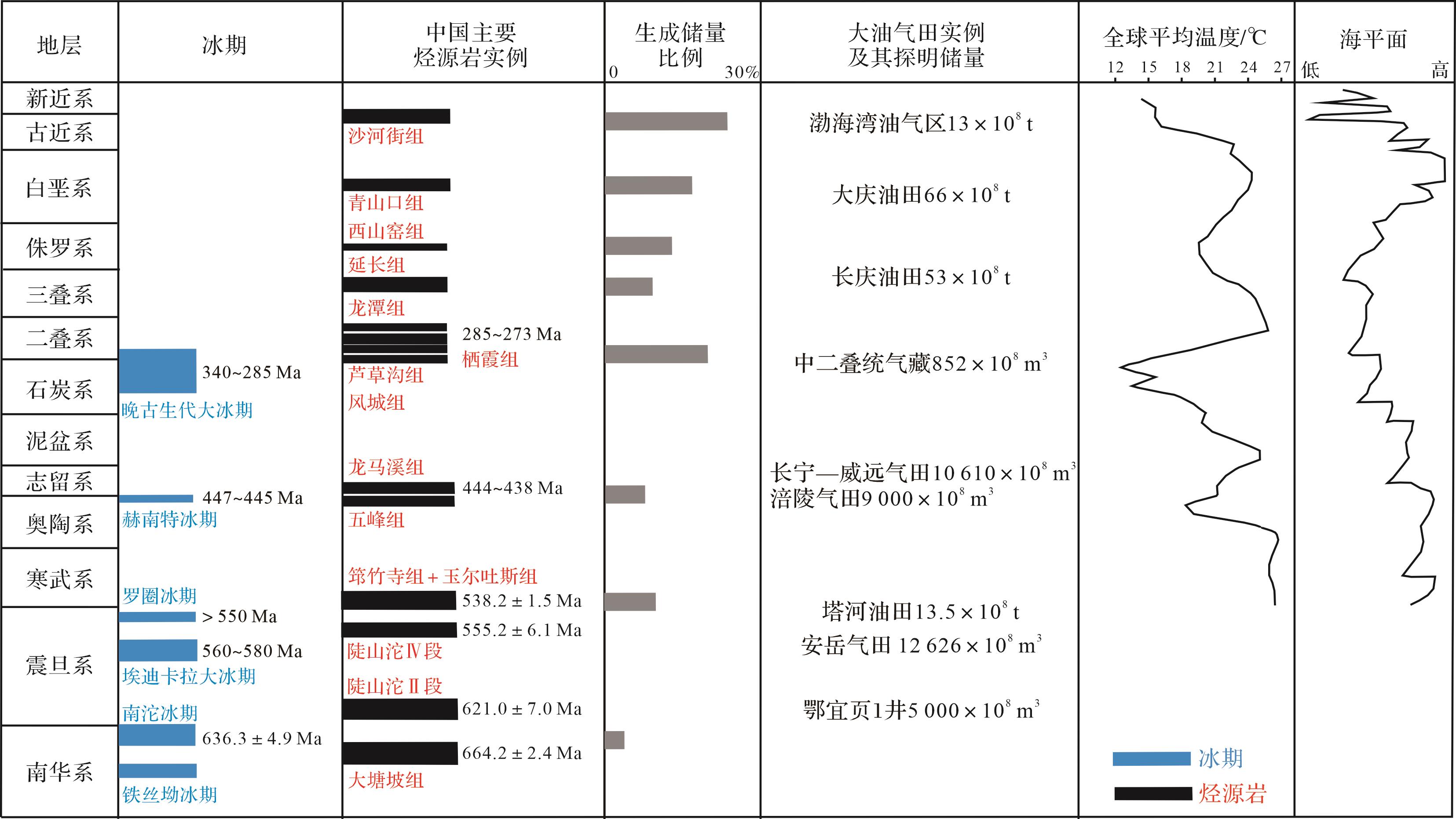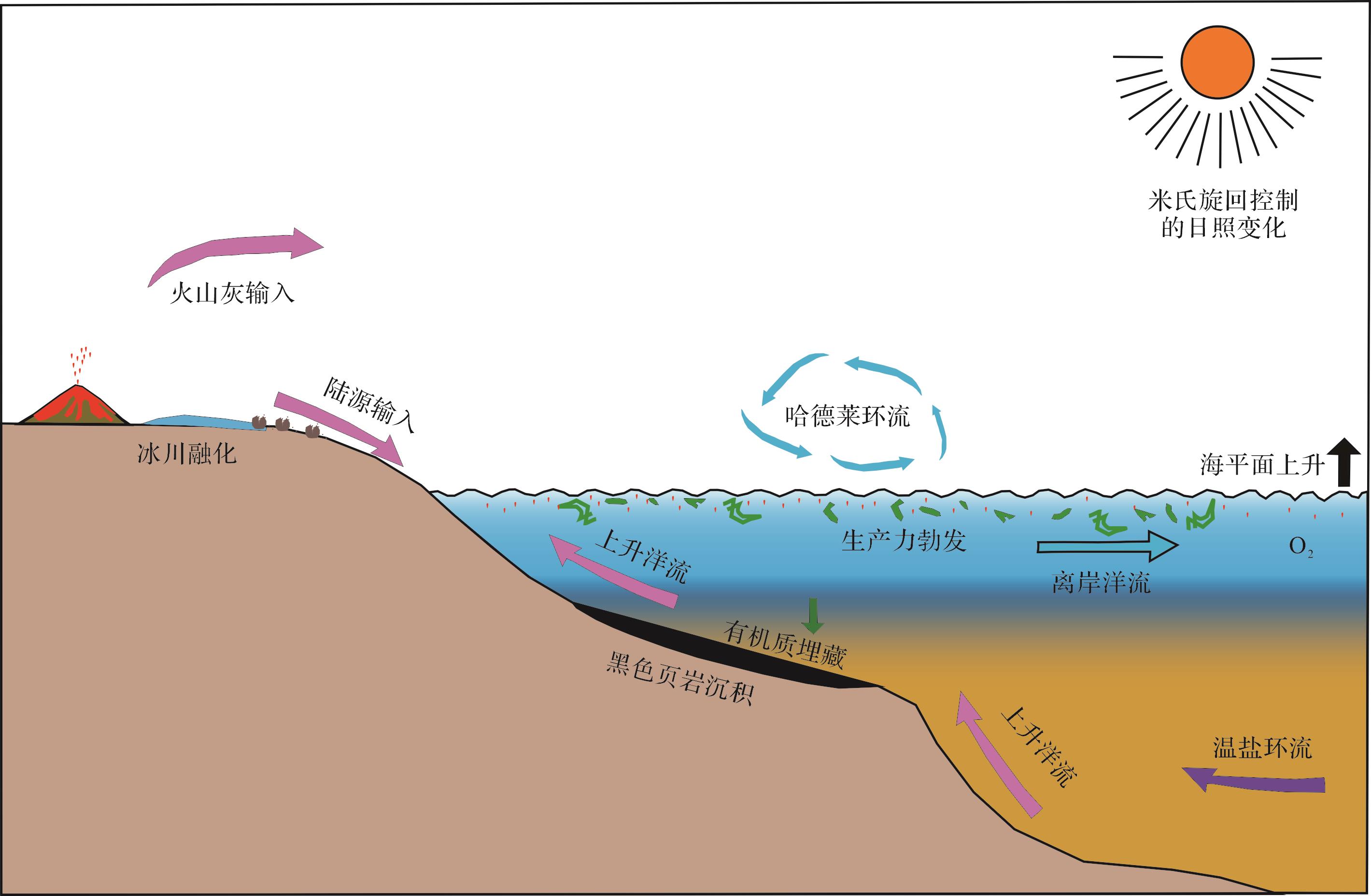意义 气候作用影响着海洋有机碳富集,现有文献主要探讨高日照量和温暖湿润气候下有机碳富集机理、总结富有机质沉积与天文周期间的关系,极少涉及冰消期海相烃源岩发育机理。我国在元古代和古生代冰消期发育了多套海相烃源岩,通过研究和总结冰消期气候对盆地有机碳富集的作用机理,有助于从地球系统的角度建立不同气候条件与有机质丰度之间的耦合关系模型。【 进展 】调研发现,我国大型油气田对应的中生代和新生代主力烃源岩发育于中高纬度温室气候期,而元古代和古生代主力烃源岩主要发育于中低纬度冰川消融期。冰消期烃源岩分布在新元古代、埃迪卡拉纪—寒武纪转换期、奥陶纪—志留纪转换期和二叠纪四个时代,其特殊的气候条件对海洋有机碳富集具有重要作用。【 结论与展望 】米氏旋回控制下的高日照量、升温和波动气候导致的岩石风化增强、广泛的海侵作用、强烈的上升流作用和间冰期频繁的火山活动,共同导致了冰消期海洋生产力提高和缺氧还原的水体环境,进而促进有机碳富集和烃源岩形成。这一冰消期气候与烃源岩形成的关系模式,体现了气候旋回控制下海洋—陆地—大气地球系统对有机碳富集的控制作用,未来可结合气候模拟和定量计算的结果,对大页岩油气田分布做出一定预测。
