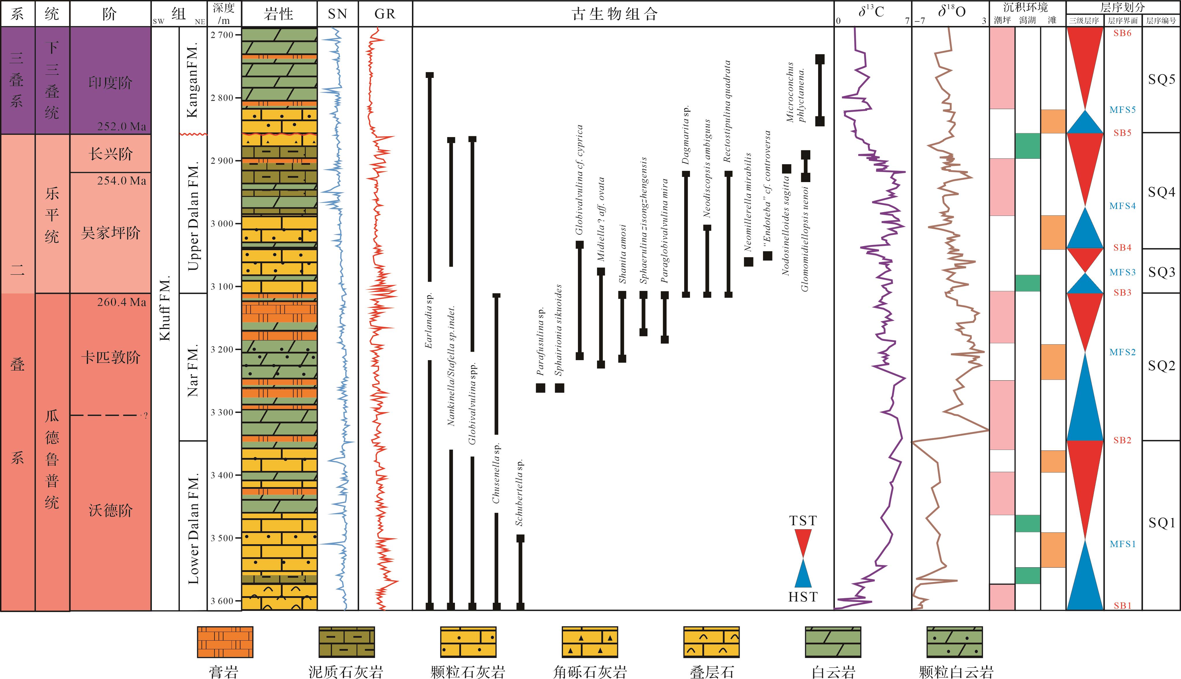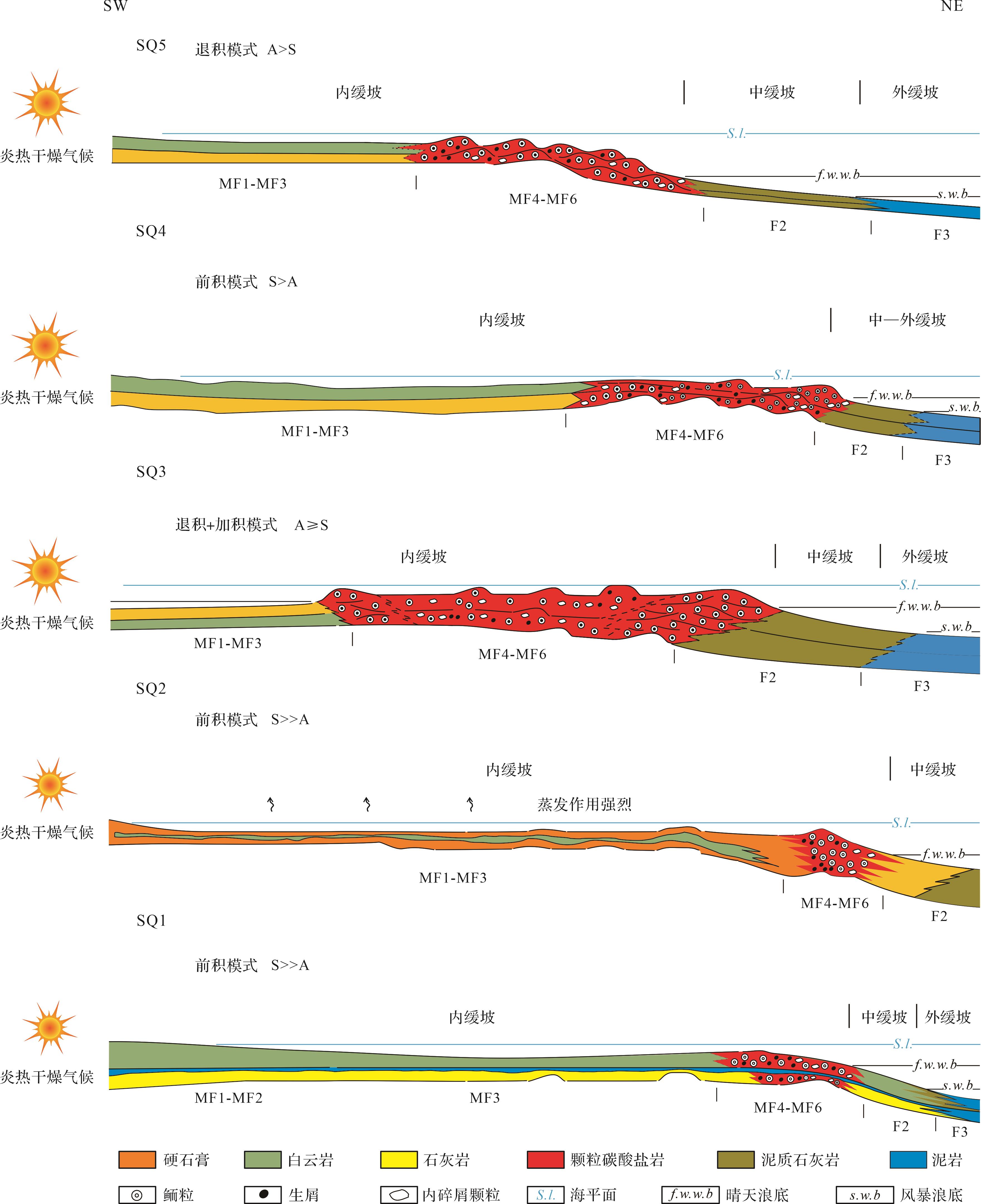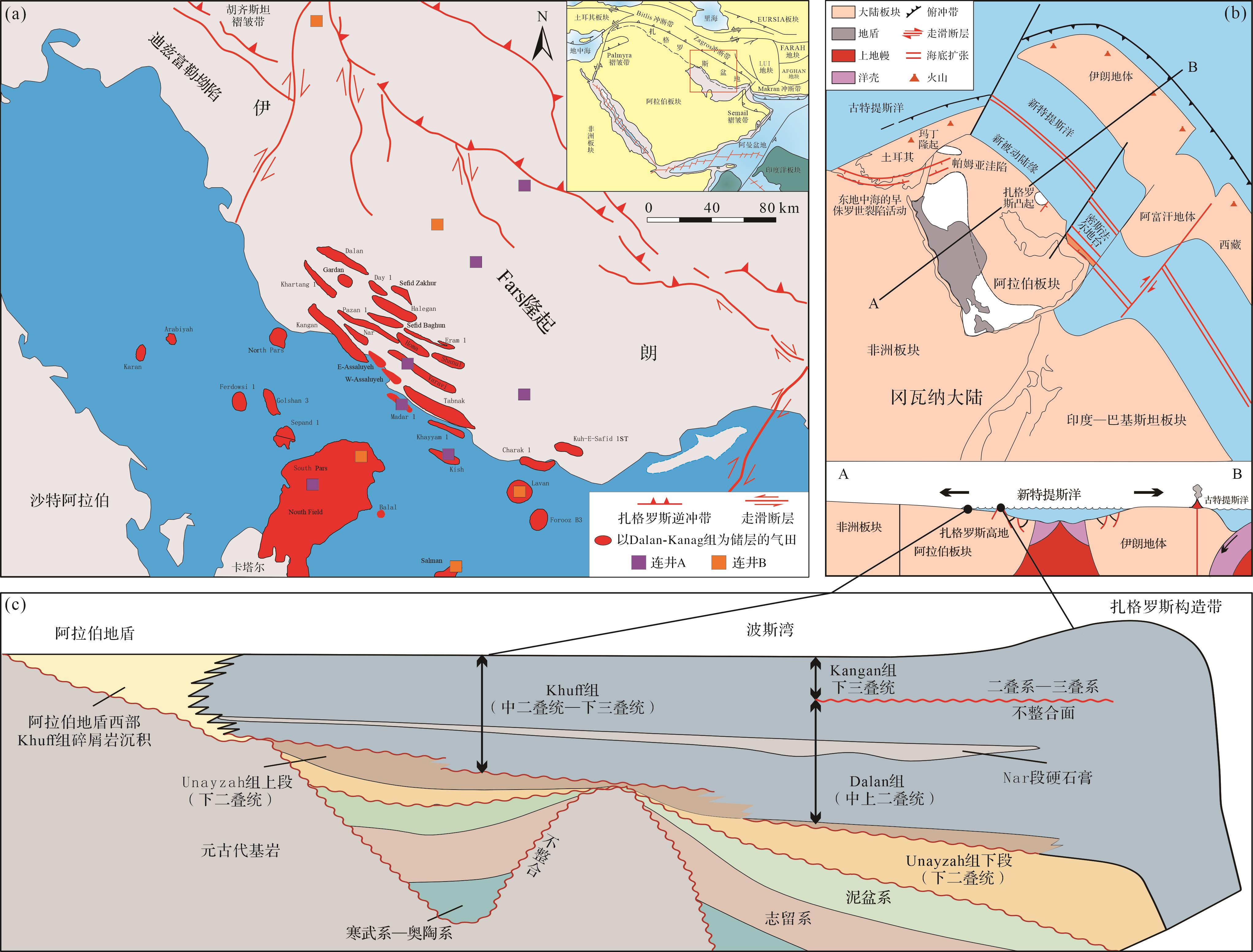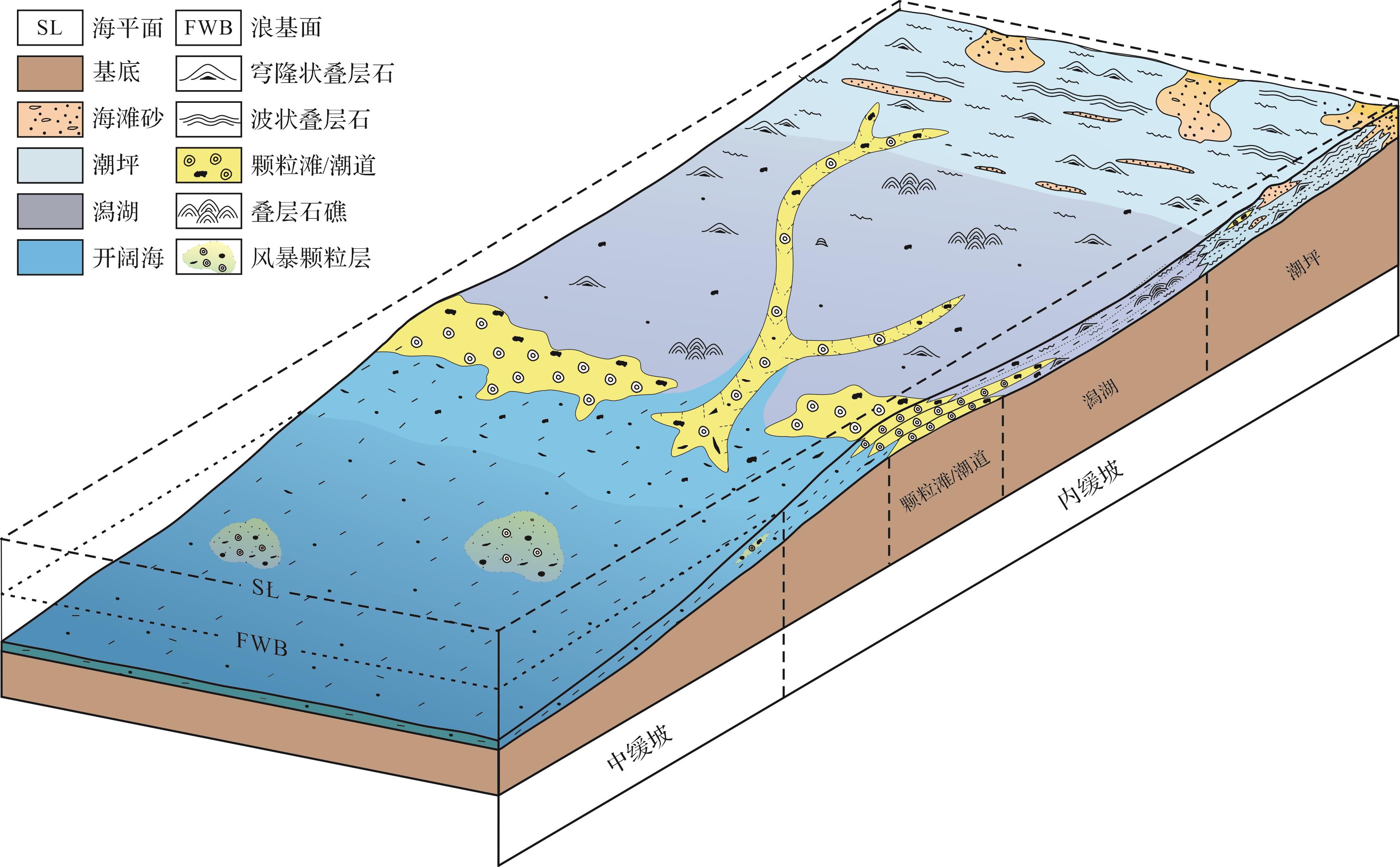 目的 波斯湾南部Fars地区中二叠统至下三叠统蕴含巨量的油气资源,目前的研究缺乏对该层系层序地层与沉积演化方面的宏观认识。 方法 以该地区中上二叠统Dalan组和下三叠统Kangan组为研究对象,基于单井和连井、岩心、薄片、测井等资料,结合区域地质背景和前人认识,对研究区中二叠统至下三叠统进行层序地层划分,深入分析了各层序可容空间变化与沉积演化过程。 结果 研究区Dalan组与Kangan组共识别出6个层序界面和5个最大海泛面,根据层序界面类型和最大海泛面的发育位置,将其划分为5个三级层序;目的层系为碳酸盐岩缓坡沉积环境,可划分为内缓坡、中缓坡和外缓坡3种沉积亚相,内缓坡可细分为潮上带萨布哈、潮间坪、潟湖、滩后、滩中和滩前共6种沉积微相;研究区目的层系沉积期为干旱炎热的浅水碳酸盐岩沉积环境,受控于可容空间与沉积物堆积速率的相对变化,SQ1~SQ2沉积期主要发育前积型沉积模式,SQ3沉积期发育退积与加积型沉积模式,SQ4沉积期发育前积型沉积模式,SQ5沉积期发育退积型沉积模式。 结论 通过对层序地层特征与沉积体系的分析,结合全球海平面与新特提斯洋的演化过程,认为构造所控制的可容空间与沉积速率的相对变化是区域沉积演化的主控因素。