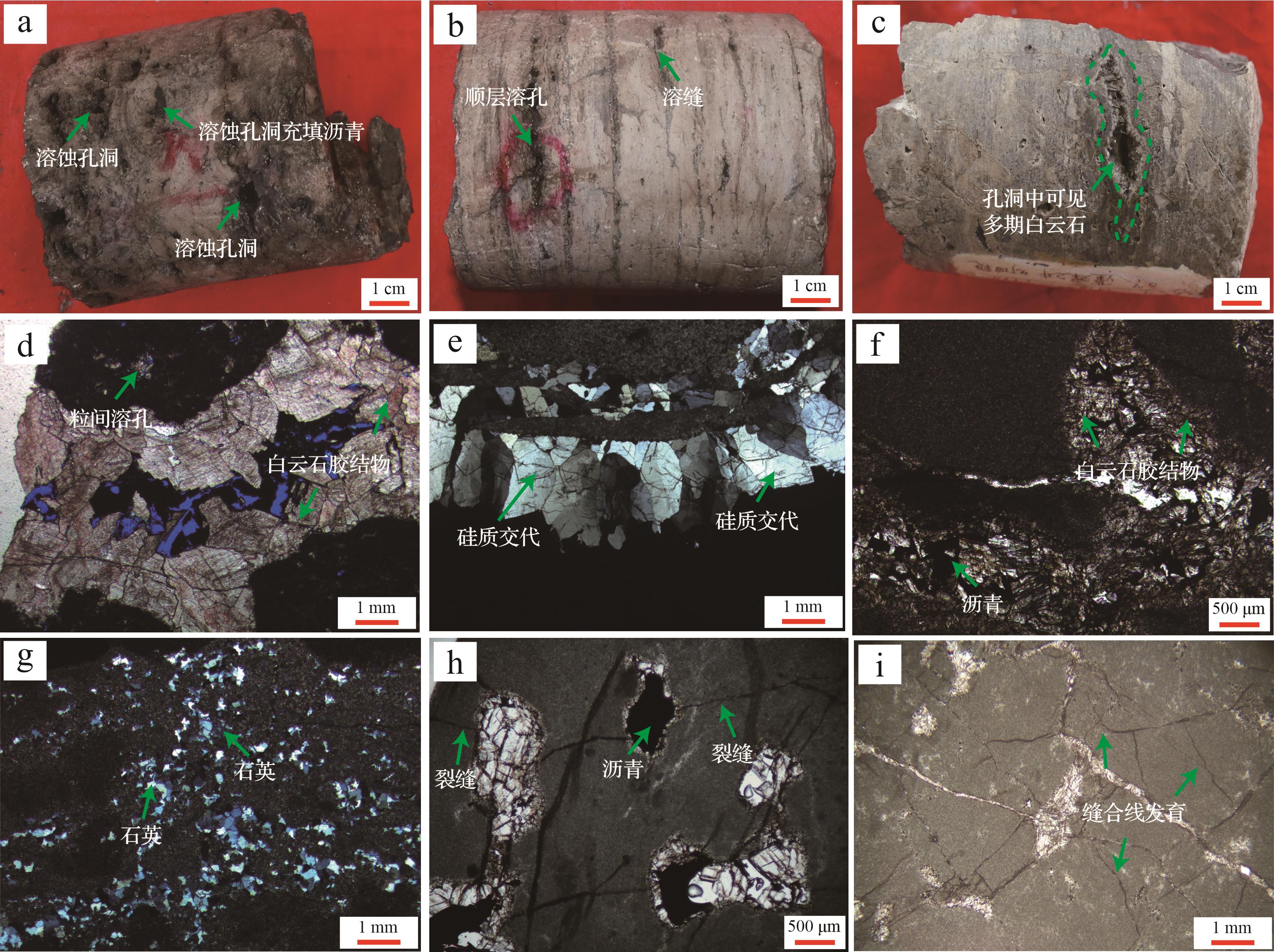 目的 川中蓬莱地区灯影组已获得重大勘探突破,但灯影组四段(灯四段)储层埋深大、时代老、成岩演化过程复杂,经历了多期次油气充注,储层孔隙演化与油气充注关系尚不清楚。 方法 基于区内钻井取心资料,通过薄片观察、阴极发光、原位微区元素分析、流体包裹体等手段对灯四段储层岩石学类型、储集空间特征、成岩作用类型、成岩演化序列、孔隙演化与油气充注关系进行了研究。 结果 蓬莱地区灯影组四段储层岩石类型主要为晶粒白云岩、颗粒白云岩和微生物白云岩三类;储集空间类型可划分为溶洞、孔隙和裂缝三种类型;主要成岩作用类型有同生—准同生期溶蚀作用、表生期溶蚀作用、埋藏溶蚀作用、胶结充填作用、构造破裂作用、硅化作用和压实压溶作用。不同阶段的成岩作用共同控制了灯四段储层孔隙演化,其中对储层起建设性成岩作用为各时期溶蚀作用、破裂作用,对储层形成起破坏性成岩作用的为压实压溶作用、胶结充填作用。 结论 灯四段储层溶蚀孔洞中胶结物充填序列可划分为:第Ⅰ世代叶片状白云石→第Ⅱ世代粉晶白云石→第Ⅰ期沥青→第Ⅲ世代细晶白云石→第Ⅳ世代中晶白云石→第Ⅴ世代粗晶白云石→第Ⅵ世代巨晶—鞍形白云石→第Ⅱ期沥青→第Ⅶ世代石英、萤石等矿物。根据各期次胶结充填物所捕获的流体包裹体的类型、相态、均一温度等信息,重建了蓬莱地区灯四段油气充注过程:志留纪中晚期古油藏充注(第Ⅰ期古油藏)→加里东晚期古油藏破坏→中三叠世古油藏充注(第Ⅱ期古油藏)→晚侏罗世古油藏裂解生气→晚白垩世至今古油气藏—气藏的调整与定型,其中晚期油裂解气→气态烃的充注是灯影组四段气藏的主要形成期。