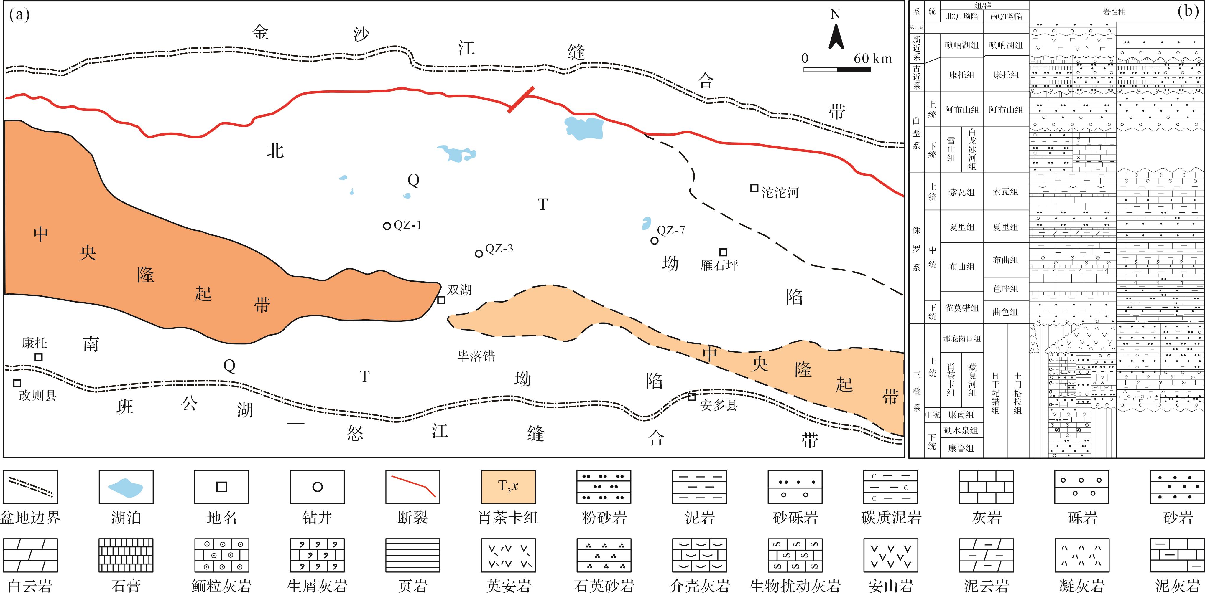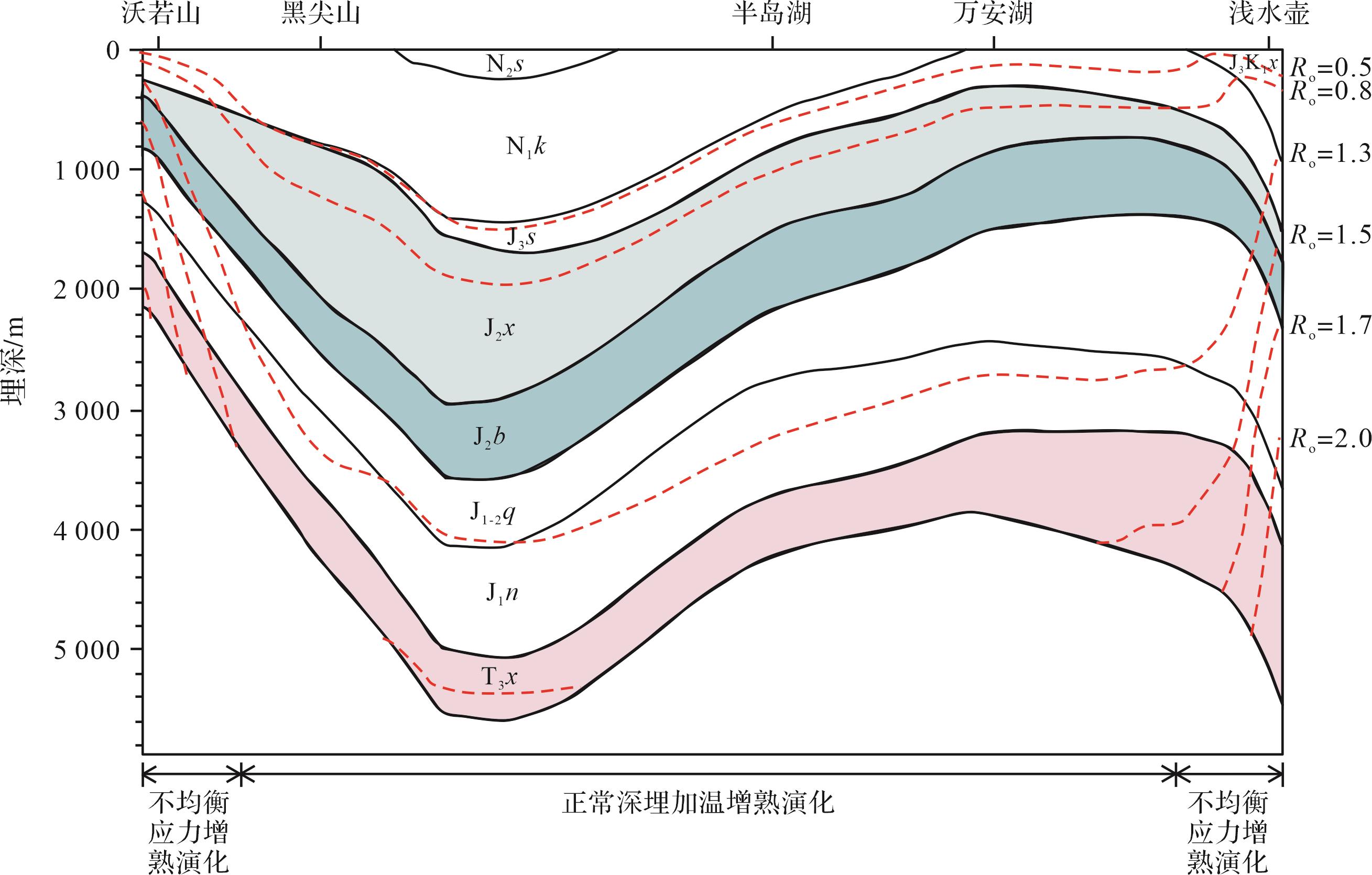 目的 QT盆地位于全球最主要的油气聚集带——特提斯构造域的东段,由于盆地目前勘探程度低,其油气资源潜力一直存在较大的分歧,恢复其关键构造期盆地剥蚀量和埋藏过程对深化QT盆地主力烃源岩生烃潜力与油气资源潜力具有重要的作用。 方法 运用构造—沉积充填外推法,分析了QT盆地主要构造活动期次,恢复关键构造期剥蚀量,同时运用TSM盆地模拟系统,分析了上三叠统—侏罗系三套烃源层埋藏过程。 结果 (1)QT盆地自晚三叠世以来经历了四期剥蚀事件:晚三叠世—早侏罗世(210~180 Ma)、早白垩世(120~110 Ma)、古新世—始新世早期(60~45 Ma)和中新世早期以来(25~ Ma);(2)210~180 Ma:盆地主体发生抬升,盆地中央隆起带和北QT坳陷剥蚀较为强烈;120~110 Ma,盆地中央隆起带及其两侧、盆地东部地区剥蚀最强烈;北QT坳陷中—西部剥蚀相对较弱;60~45 Ma,盆地平均抬升剥蚀约0.75 km左右;25 Ma以来,盆地具有整体抬升性质;(3)受地层沉积厚度、多期构造抬升差异性剥蚀等影响,QT盆地上三叠统—侏罗系烃源层两次最大埋深分别发生在雪山组沉积之后、古近系康托组及新近系唢呐湖组沉积之后。两期主力生烃期与最大埋深及其随后的构造抬升相对应;(4)两套烃源岩生烃演化存在较大差异:肖茶卡组(T3x)烃源层生烃相对较早,成烃演化周期较长;布曲组(J2b)烃源层、夏里组(J2x)烃源层生烃相对较晚,尤其J2x烃源层,地史时期曾有过生烃停滞过程,古近系沉积后进入二次生烃演化阶段,现今仍有持续生烃潜力。 结论 QT盆地上三叠统—侏罗系烃源岩经历不同的隆升剥蚀史,生烃演化过程存在明显的差异;平面上,地层保存最为完好,北QT坳陷中—西部资源潜力大,应是下一步有利勘探区。