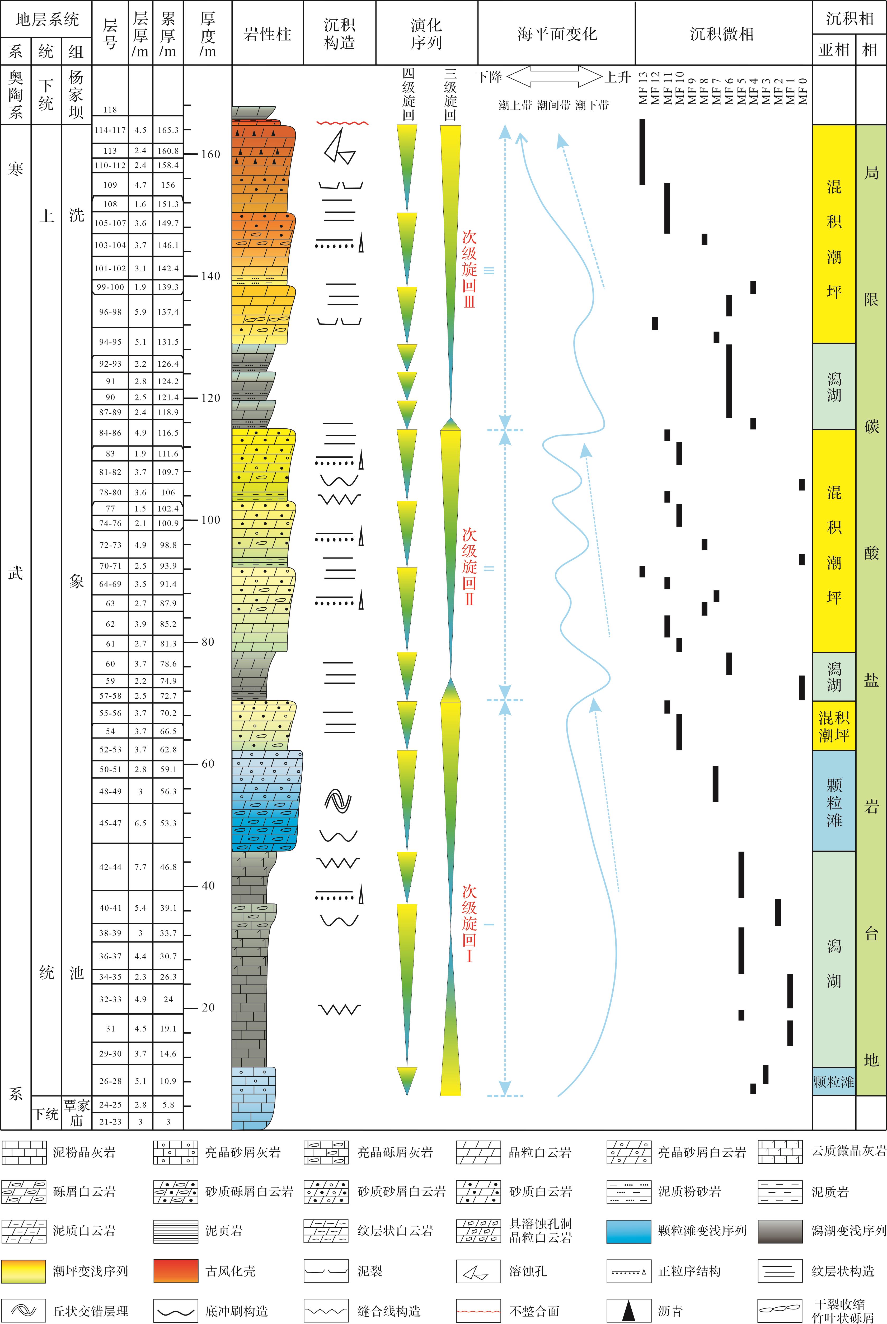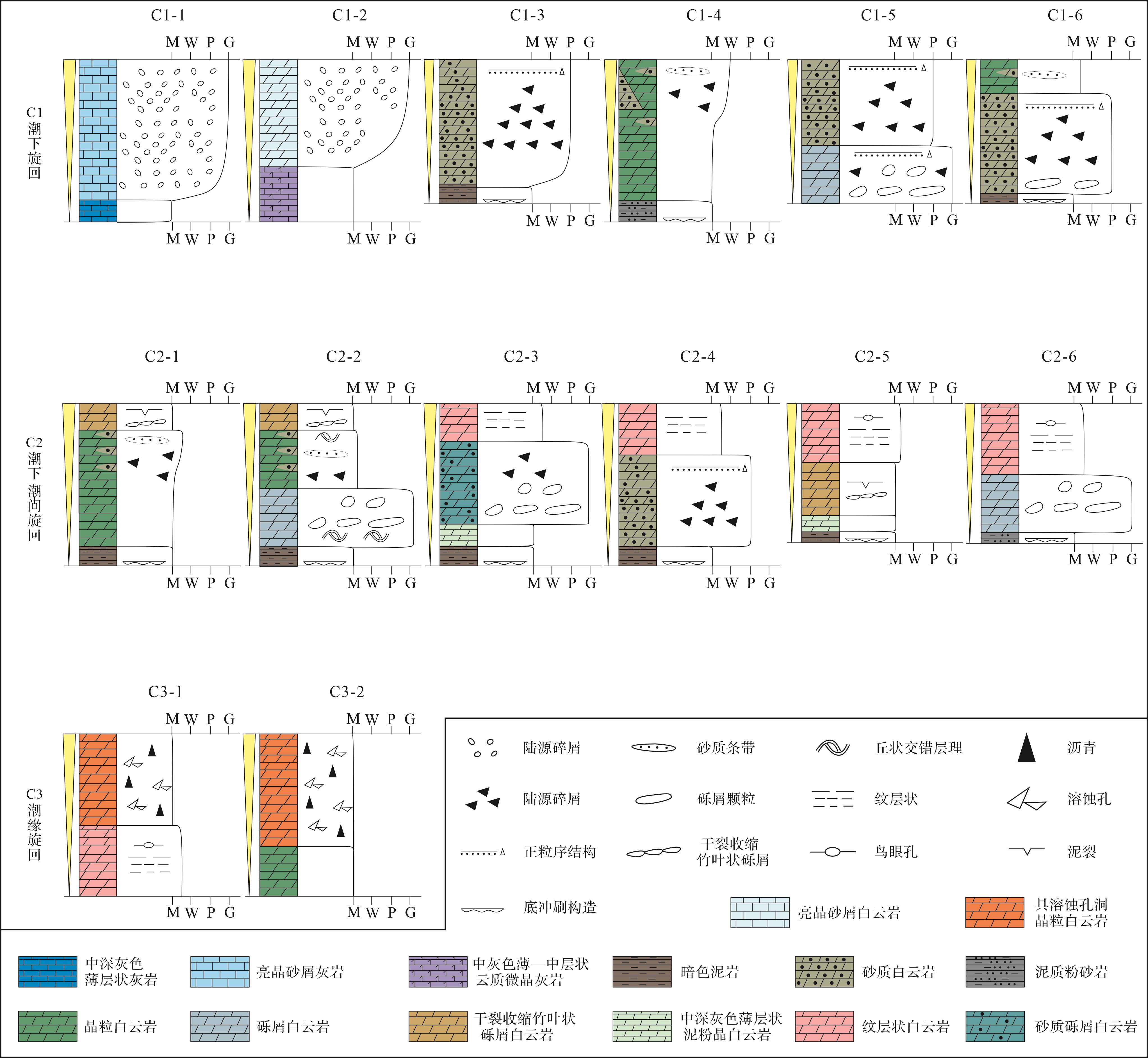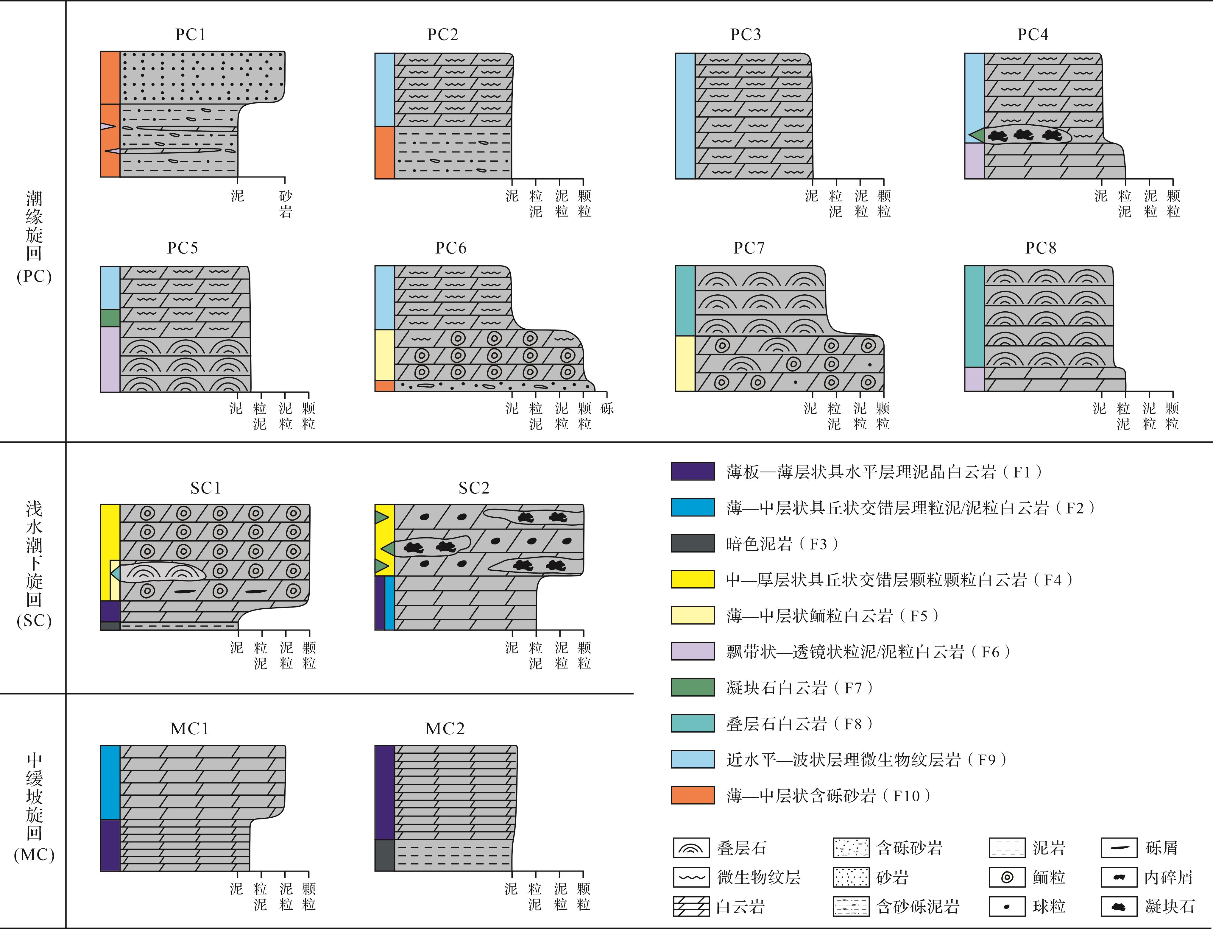 目的 向上变浅序列在浅水碳酸盐环境中广泛发育,深时碳酸盐岩向上变浅序列的识别,对于分析浅水碳酸盐岩沉积环境演化具有独特优势。 方法 通过对上扬子北缘城口修齐镇上寒武统洗象池组进行详细的野外沉积学解剖和室内微相解析,识别碳酸盐岩向上变浅序列,分析其组合特征和纵向叠置关系,进而探讨上扬子地区晚寒武世沉积环境演化过程。 结果 在洗象池组中识别出MF0泥页岩、MF1泥粉晶灰岩、MF2亮晶砾屑灰岩、MF3亮晶砂屑灰岩、MF4泥质粉砂岩、MF5云质微晶灰岩、MF6砾屑白云岩、MF7亮晶砂屑白云岩、MF8砂质砾屑白云岩、MF9砂质砂屑白云岩、MF10砂质白云岩、MF11纹层状白云岩、MF12竹叶状砾屑白云岩、MF13具有溶蚀孔洞晶粒白云岩为主的14类沉积微相;根据微相组合关系,识别出C1-1、C1-2、C1-3、C1-4、C1-5、C1-6分米级向上变浅的潮下沉积序列、C2-1、C2-2、C2-3、C2-4、C2-5、C2-6分米级向上变浅的潮下—潮间沉积序列、C3-1、C3-2分米级向上变浅的潮间—潮上沉积序列,这些分米级向上变浅旋回构成3个次级海侵—海退沉积旋回,而3个次级旋回又从下至上构成洗象池组1个快速海侵—缓慢海退的向上变浅沉积旋回。 结论 基于识别向上变浅沉积序列并分析其组合特征、纵向叠置关系,认为上寒武统洗象池组受高频海平面变化影响明显,整体经历了早期快速海侵、晚期缓慢海退并发生多期次级海平面升降旋回,形成以混积潮坪亚相、云质潟湖亚相、台内颗粒滩亚相为典型沉积特征的局限碳酸盐岩台地沉积模式。同时,也进一步证实了晚寒武世发生了全球性的海平面下降事件。