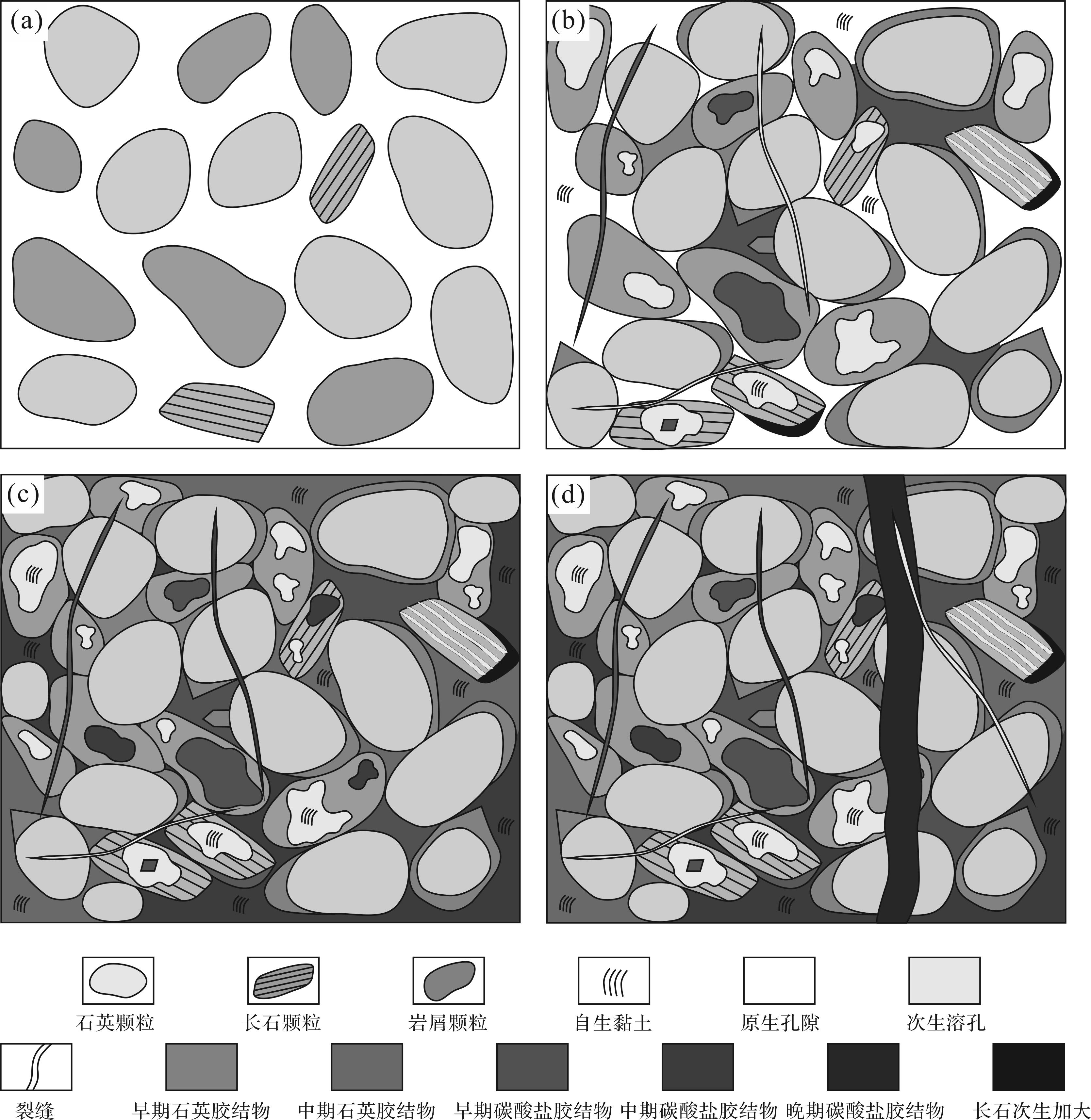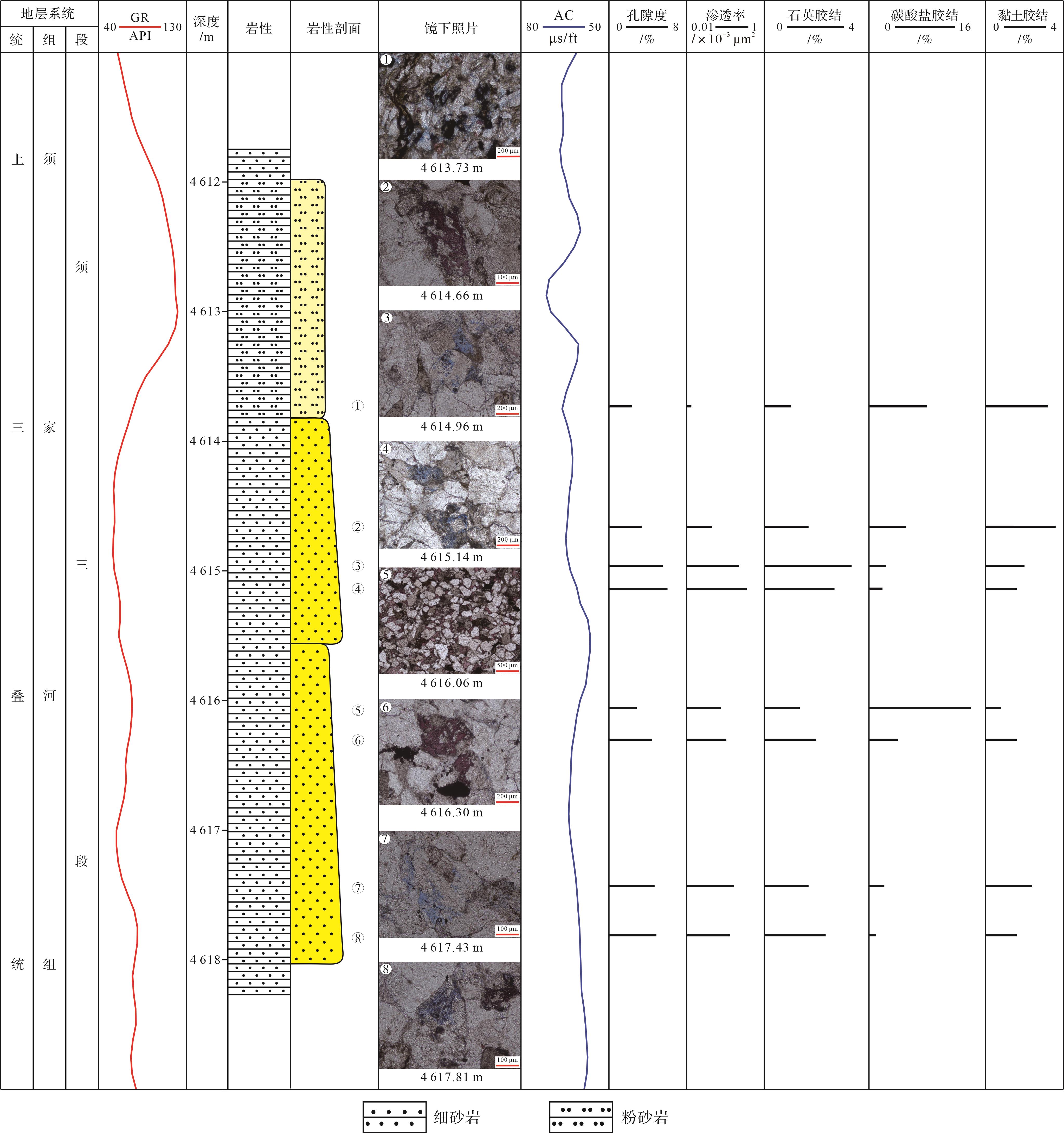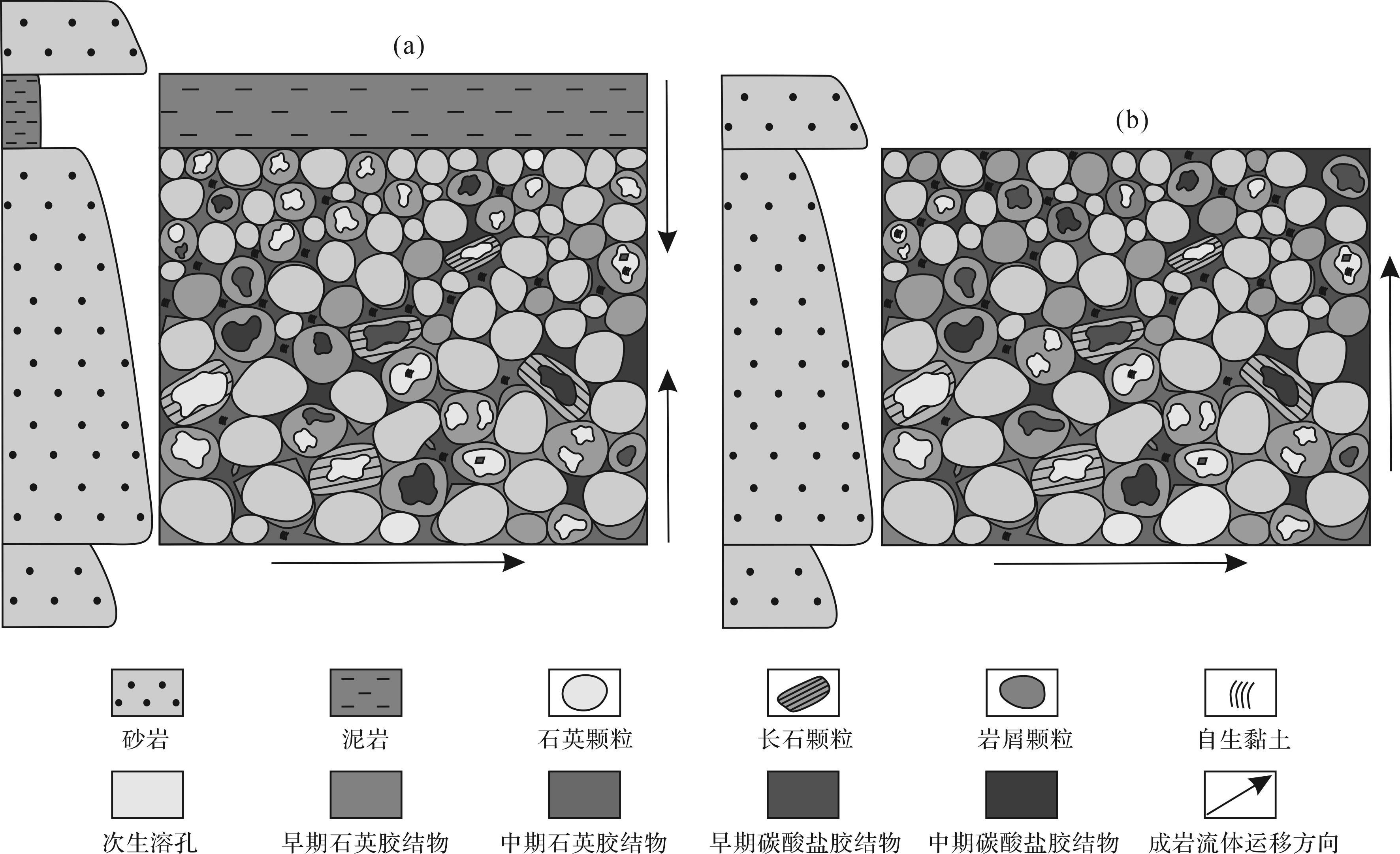 目的 明确烃源岩层须三段中致密砂岩优质储层发育模式,为川西坳陷须三段致密砂岩气勘探开发提供理论指导。 方法 综合岩心、薄片、扫描电镜、包裹体、原位碳氧同位素以及孔渗等资料,开展川西坳陷须三段致密砂岩储层基本特征及成岩作用类型表征,在此基础上对储层非均质性及优质储层发育模式进行系统分析。 结果 川西坳陷须三段致密砂岩储层主要岩石类型为岩屑石英砂岩和岩屑砂岩,储集空间以粒内溶孔和裂缝为主,孔隙度小于7%,渗透率小于1×10-3 μm2,可划分为粒内溶孔型和裂缝—粒内溶孔型两类储层。砂岩储层成岩作用包括压实作用、胶结作用(石英、碳酸盐、黏土和长石)和溶蚀作用,在演化过程中分别受早期腐殖酸、中期有机酸和晚期热液流体改造。须三段可识别出砂岩—砂岩和砂岩—泥岩两类垂向叠置单沉积旋回。 结论 早期的腐殖酸和中期的有机酸可通过粒间孔喉和裂缝迁移,对储层进行接力溶蚀成孔改造,有利于储层的形成,而晚期热液流体仅局限作用于粗大裂缝中,对储层质量无实质影响;砂岩—砂岩垂向叠置在单沉积旋回中,优质储层主要发育在粒度相对较粗的旋回下部,砂岩—泥岩垂向叠置在单沉积旋回中,优质储层主要发育在粒度相对较粗的旋回下部和近泥岩段的旋回上部。