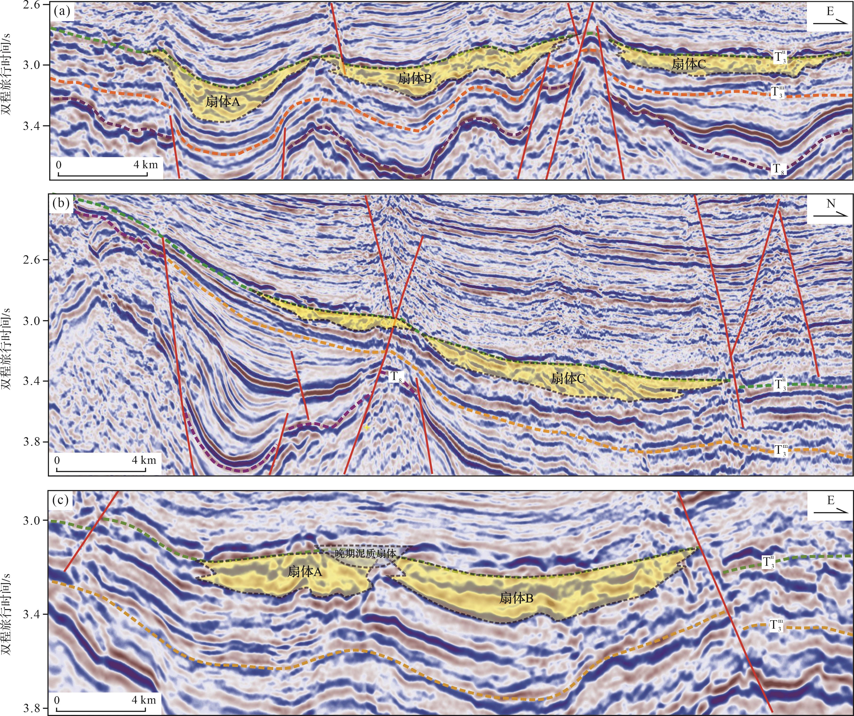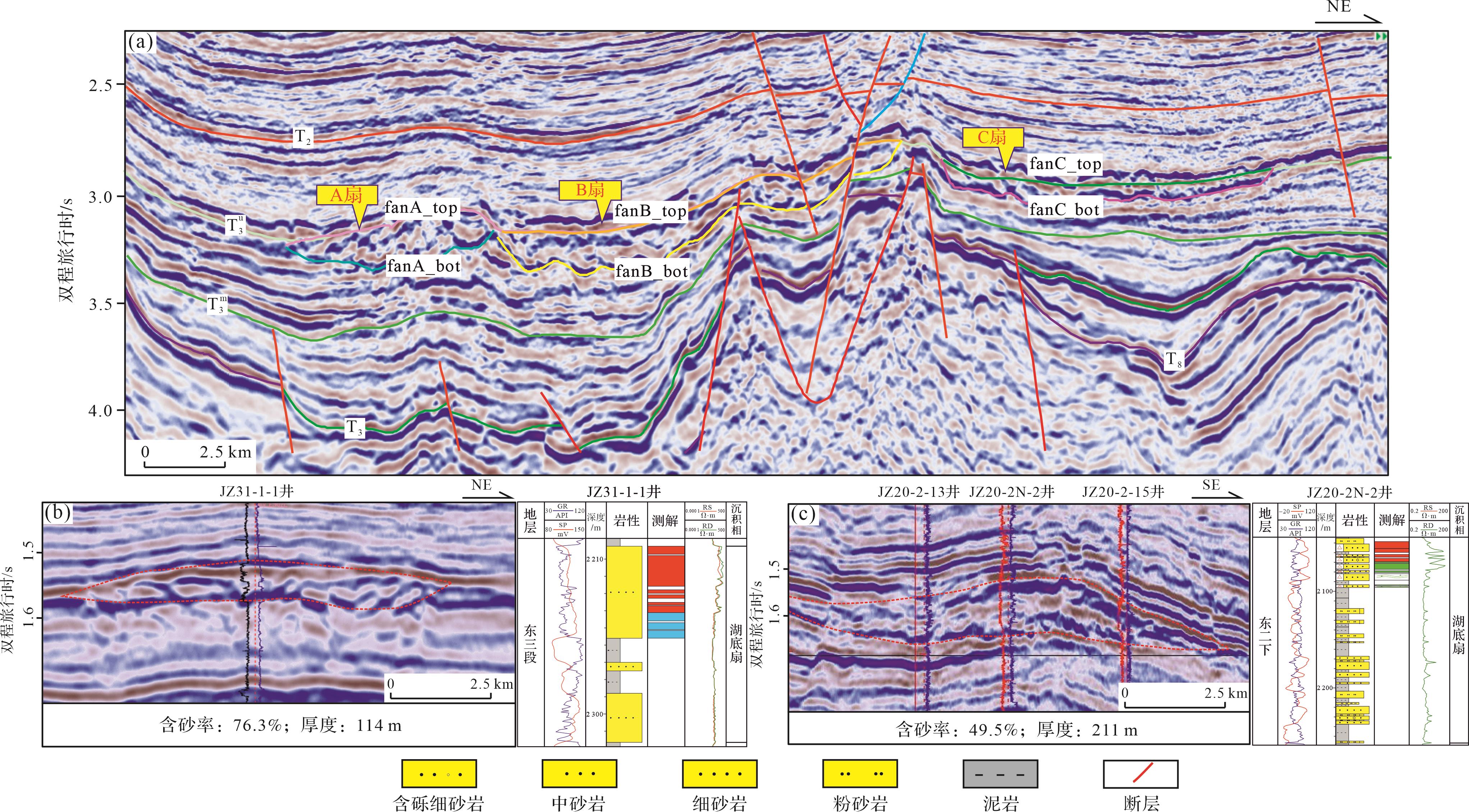 目的 渤中凹陷东南部斜坡带东营组湖底扇成因机制和沉积充填过程尚不明确,制约了研究区湖底扇的精细研究和井位部署。 方法 利用三维地震资料,从源—汇系统角度,半定量表征了渤南低凸起物源区的剥蚀能力与搬运路径,开展了大型湖底扇的沉积响应特征和源—汇耦合机制研究,总结了湖底扇的沉积充填过程与发育模式。 结果 (1)东二层序处于湖盆断陷转换阶段,可划分为两个三级层序。其中,湖底扇发育在东二下层序高位域时期;(2)东二下时期渤南低凸起东段剥蚀通量大于湖底扇的沉积通量。渤南低凸起东段近物源提供的碎屑物质,沿着7条古沟谷和5个限制性古沟槽等搬运通道,在斜坡沉积坡折之下卸载。近物源供给、搬运通道、沉积坡折三者耦合形成了大型连片分布的湖底扇沉积;(3)湖底扇沉积充填受控于限制性古地貌发育位置与可容纳空间大小。其中,早期限制性古地貌形成的可容纳空间大,湖底扇砂体优先卸载,形成A、B、C三大扇体沉积,由于两侧的空间限制,水动力条件强,地震相表现为杂乱的下切水道与侧向迁移叠加的特征,形成的扇体富砂性较好。随着后期不断补充的重力流进入,可容纳空间逐渐减小,而重力流沿补给通道向开阔的湖盆中心满溢,形成D和E两个扇体,由于能量逐渐减弱,地震相具有层状强振幅反射特征,水道特征不明显,富砂性中等。晚期物源供应和能量较弱,对早期扇体进行局部侵蚀和改造,地震相表现出弱振幅反射,形成的水道以泥质充填为主。大型湖底扇具有早期限制性充填、中期溢流调整和晚期侵蚀改造的时空分布和演化规律,构成了横向连片和垂向多期叠加的发育特征。 结论 一台阶之下的A、B、C三个扇体富砂性较好,埋藏浅,具有良好的油气运移与聚集条件,且储盖组合优良。其中刻画的C扇体甜点区面积大,是近年来渤海岩性油气藏勘探的重要目标。