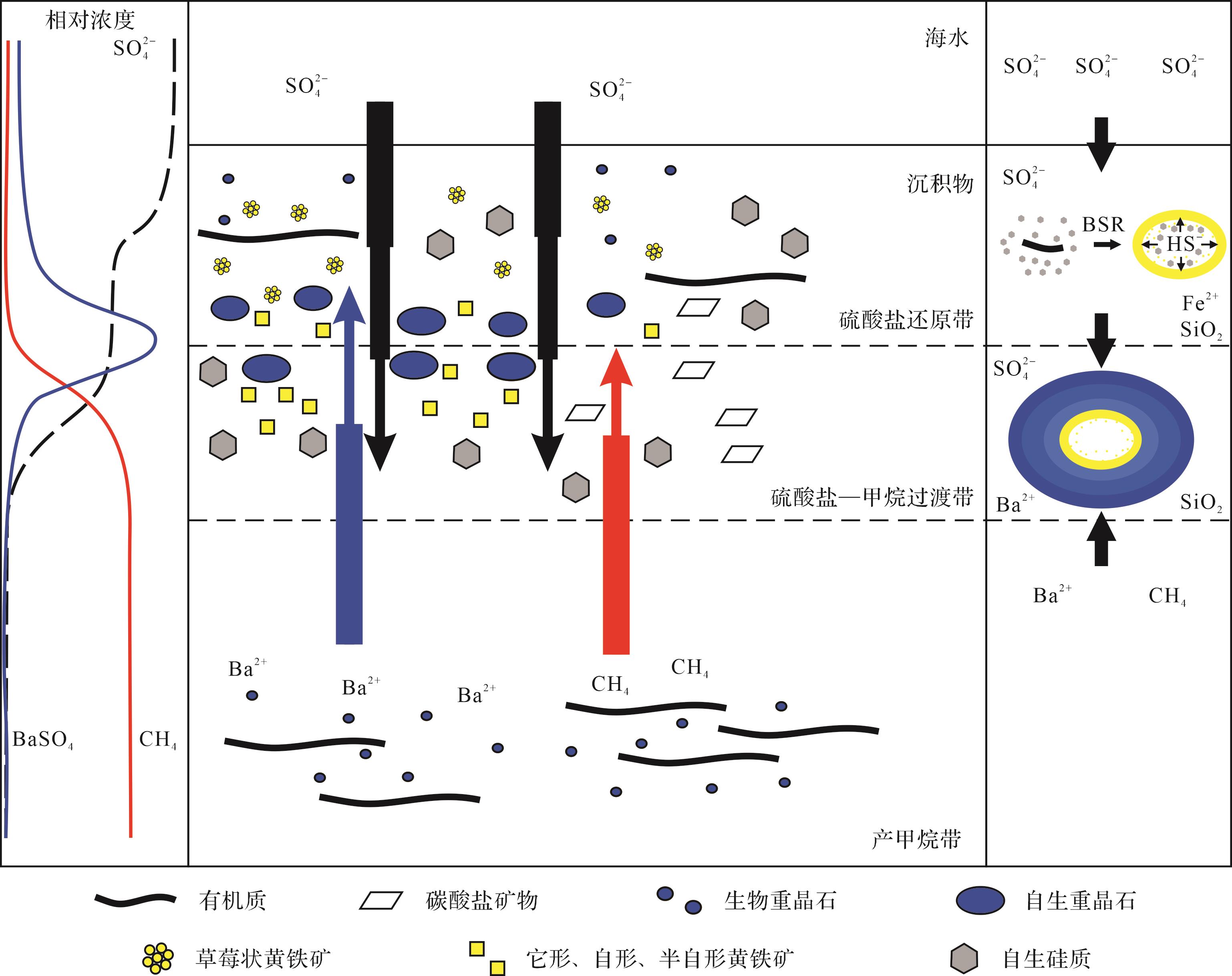 目的 埃迪卡拉纪早期的海洋氧化还原状态一直是研究热点。通过分析陡山沱组下部重晶石结核的形成过程,旨在恢复埃迪卡拉纪早期的古海洋环境的氧化还原界面变化情况。 方法 通过沉积学、岩石矿物学分析,详细分析扬子板块北部金瓜墩剖面陡山沱组下部重晶石结核的形成过程,以此来推断其沉积环境。 结果 围岩层理围绕结核展布,显示结核形成于早期埋藏阶段。结核主要由重晶石、石英和黄铁矿组成,矿物分布具空间差异,核部以黄铁矿为主,核部外围则以重晶石为主。大部分重晶石结核核心部位发育自形/半自形黄铁矿聚合体和石英矿物;核心向外缘方向发育放射状交织生长的重晶石与石英矿物聚合体。研究认为重晶石结核矿物分布的不均一性反映了结核形成时环境条件的变化:结核核部的黄铁矿、石英形成于硫酸盐还原带;之后结核生长位置过渡到硫酸盐—甲烷过渡带,产甲烷带有机质分解过程释放的钡离子向上迁移,在硫酸盐—甲烷过渡带上部与硫酸根离子反应生成重晶石沉积。 结论 重晶石结核的形成具有阶段性。随着硫酸根浓度的升高,埃迪卡拉纪早期海洋中硫酸盐还原界面可能已经下降到水岩界面附近的沉积物中,部分甲烷在硫酸盐—甲烷过渡带被氧化,从而减少了它们向大气中的排放。