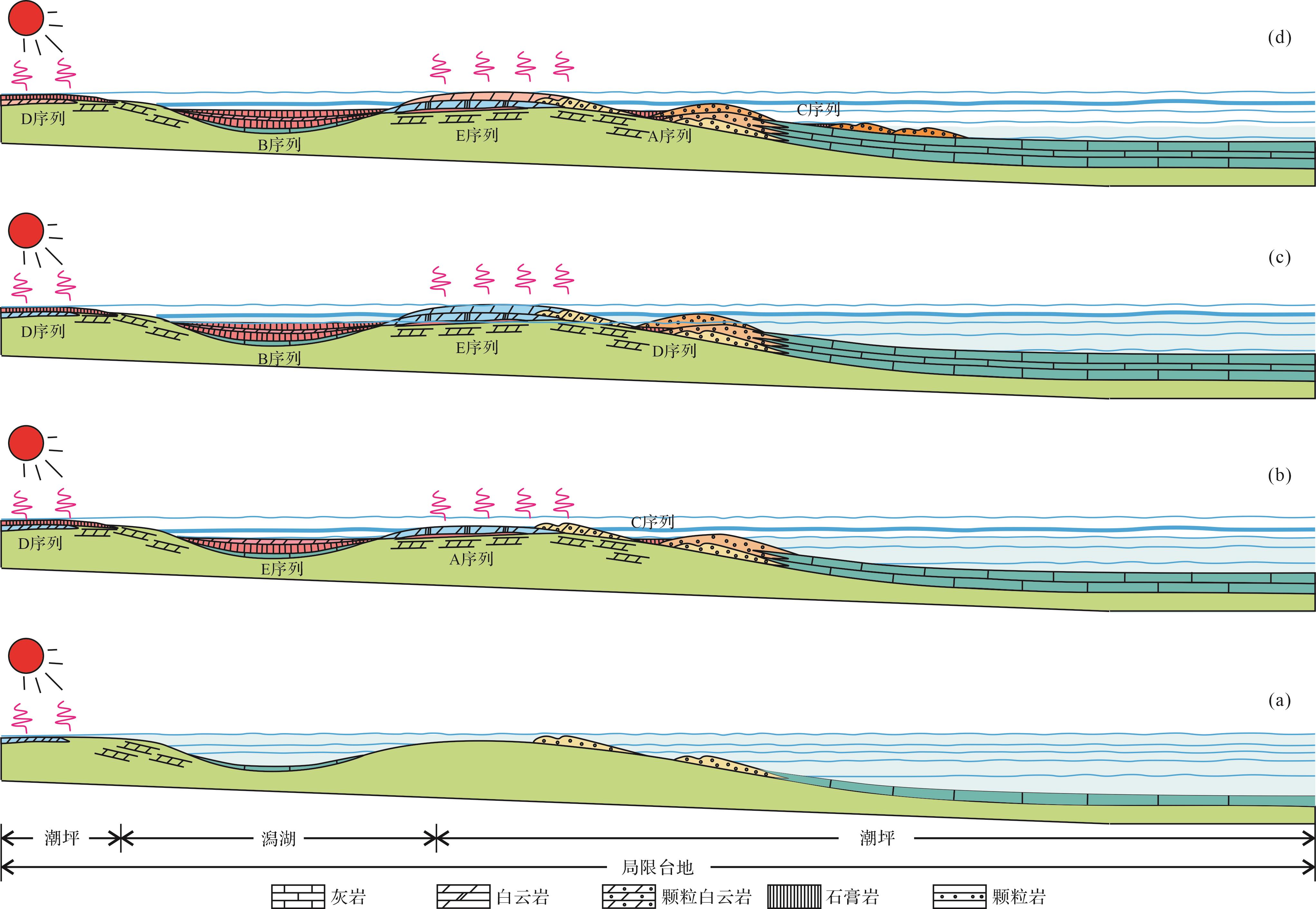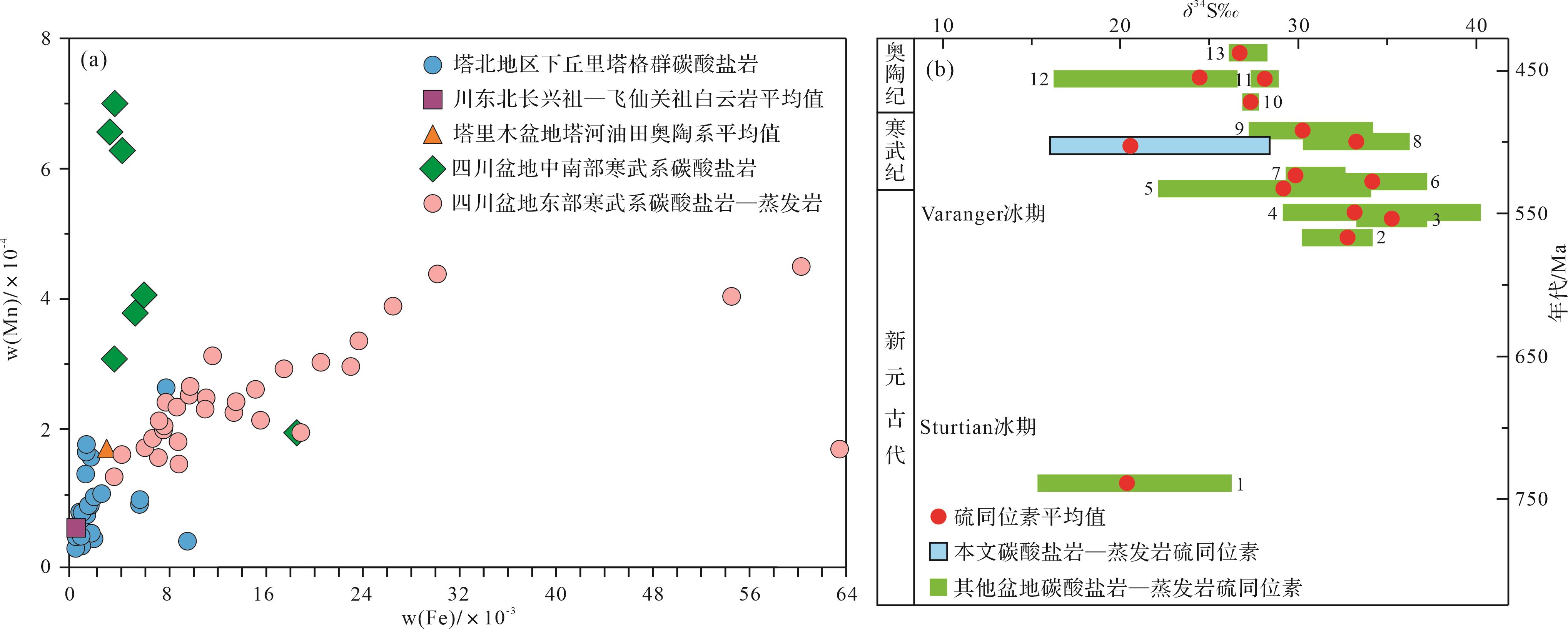 目的 碳酸盐岩—蒸发岩共生体系在四川盆地寒武系广泛分布,然而该共生体系的发育特征、沉积环境、沉积过程和演化模式研究薄弱,研究方法亟待厘清。 方法 以四川盆地东部寒武系高台组为例,基于钻井取心、野外剖面、岩石薄片和碳氧同位素、Fe与Mn含量及S同位素组成等资料,探讨共生体系的岩石学特征,蒸发岩的赋存状态,共生体系的沉积环境及沉积过程和演化模式。 结果 (1)研究区碳酸盐岩—蒸发岩共生体系发育五种碳酸盐岩—蒸发岩共生体系岩石组合序列,包括碳酸盐岩与蒸发岩互层、蒸发岩夹碳酸盐岩、蒸发岩上覆碳酸盐岩、碳酸盐岩上覆蒸发岩和碳酸盐岩夹蒸发岩。(2)δ13C主要集中在-1.00‰~3.00‰,δ18O主要集中在-9.00‰~-8.00‰,利用碳氧同位素数值计算古盐度及古温度结果表明,绝大多数Z值大于120,且δ13C值大于-2.00‰,古海水温度介于23.10 ℃~40.64 ℃;Fe主要集中在(0~2 000)×10-5;Mn主要集中在(1~30)×10-5,说明在高台组时期,沉积环境为温暖或炎热的古气候和咸化海水环境,水体氧化程度较高,经历了与大气水有关的相对开放体系中的成岩作用。(3)干旱炎热气候和高盐度富Ca2+低SO
