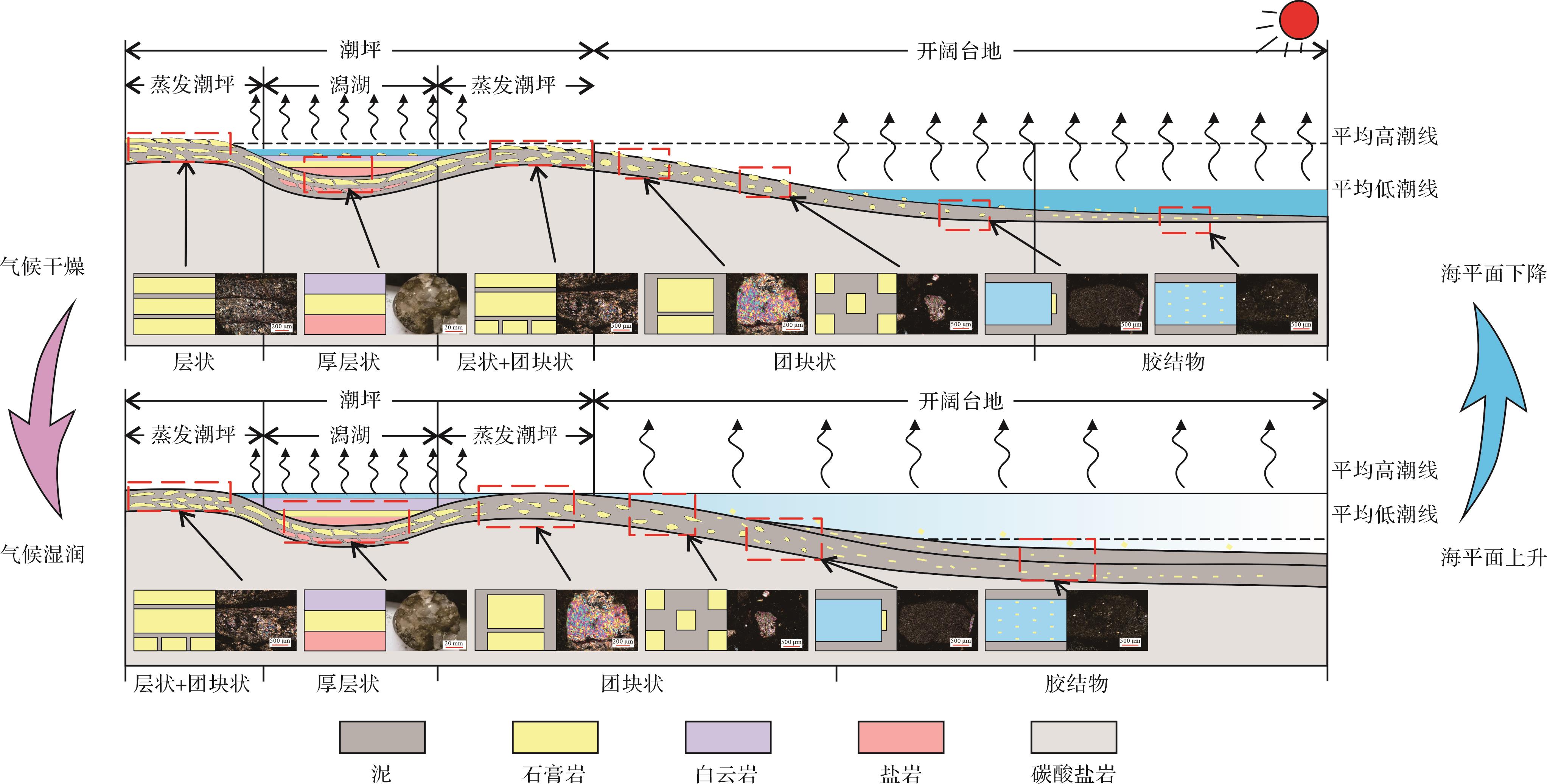 目的 碳酸盐岩—蒸发岩共生体系在四川盆地寒武系广泛分布,然而该共生体系的发育特征、沉积环境、沉积过程和演化模式研究薄弱,研究方法亟待厘清。 方法 以四川盆地东部寒武系高台组为例,基于钻井取心、野外剖面、岩石薄片和碳氧同位素、Fe与Mn含量及S同位素组成等资料,探讨共生体系的岩石学特征,蒸发岩的赋存状态,共生体系的沉积环境及沉积过程和演化模式。 结果 (1)研究区碳酸盐岩—蒸发岩共生体系发育五种碳酸盐岩—蒸发岩共生体系岩石组合序列,包括碳酸盐岩与蒸发岩互层、蒸发岩夹碳酸盐岩、蒸发岩上覆碳酸盐岩、碳酸盐岩上覆蒸发岩和碳酸盐岩夹蒸发岩。(2)δ13C主要集中在-1.00‰~3.00‰,δ18O主要集中在-9.00‰~-8.00‰,利用碳氧同位素数值计算古盐度及古温度结果表明,绝大多数Z值大于120,且δ13C值大于-2.00‰,古海水温度介于23.10 ℃~40.64 ℃;Fe主要集中在(0~2 000)×10-5;Mn主要集中在(1~30)×10-5,说明在高台组时期,沉积环境为温暖或炎热的古气候和咸化海水环境,水体氧化程度较高,经历了与大气水有关的相对开放体系中的成岩作用。(3)干旱炎热气候和高盐度富Ca2+低SO4 2 - 的“方解石海”的条件背景下,海相碳酸盐岩—蒸发岩共生体系沉积时期可分为海平面下降期蒸发岩—白云岩沉积阶段和海平面上升期白云岩—蒸发岩—灰岩沉积阶段;“潮坪萨布哈模式”和“水下浓缩沉积模式”是碳酸盐岩—蒸发岩共生体系发育的两种模式。 结论 碳酸盐岩—蒸发岩共生体系承载了沉积时期的古环境、古气候以及古海水化学等信息,也记录了共生体系沉积过程和演化模式,该研究为寒武系高台组海相蒸发环境碳酸盐岩—蒸发岩共生体系沉积环境和沉积模式提供了新的思路与认识。