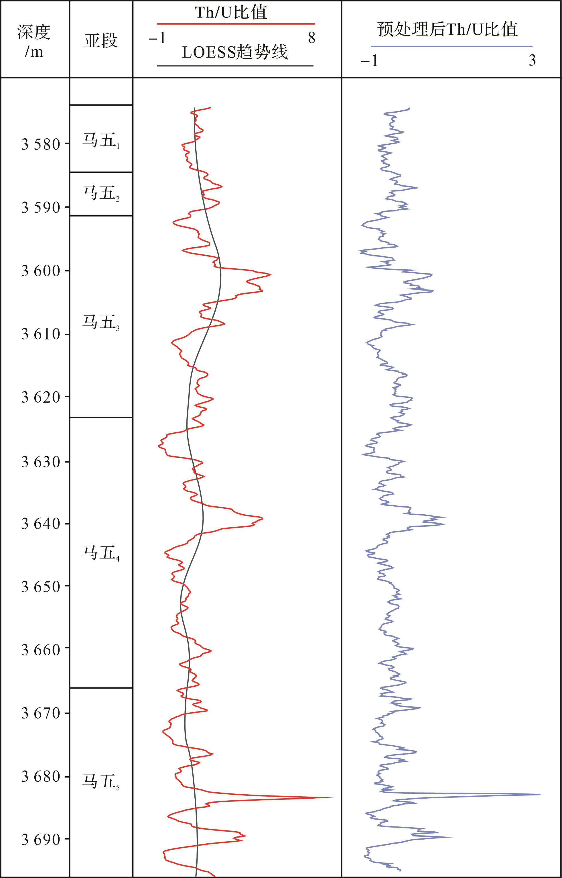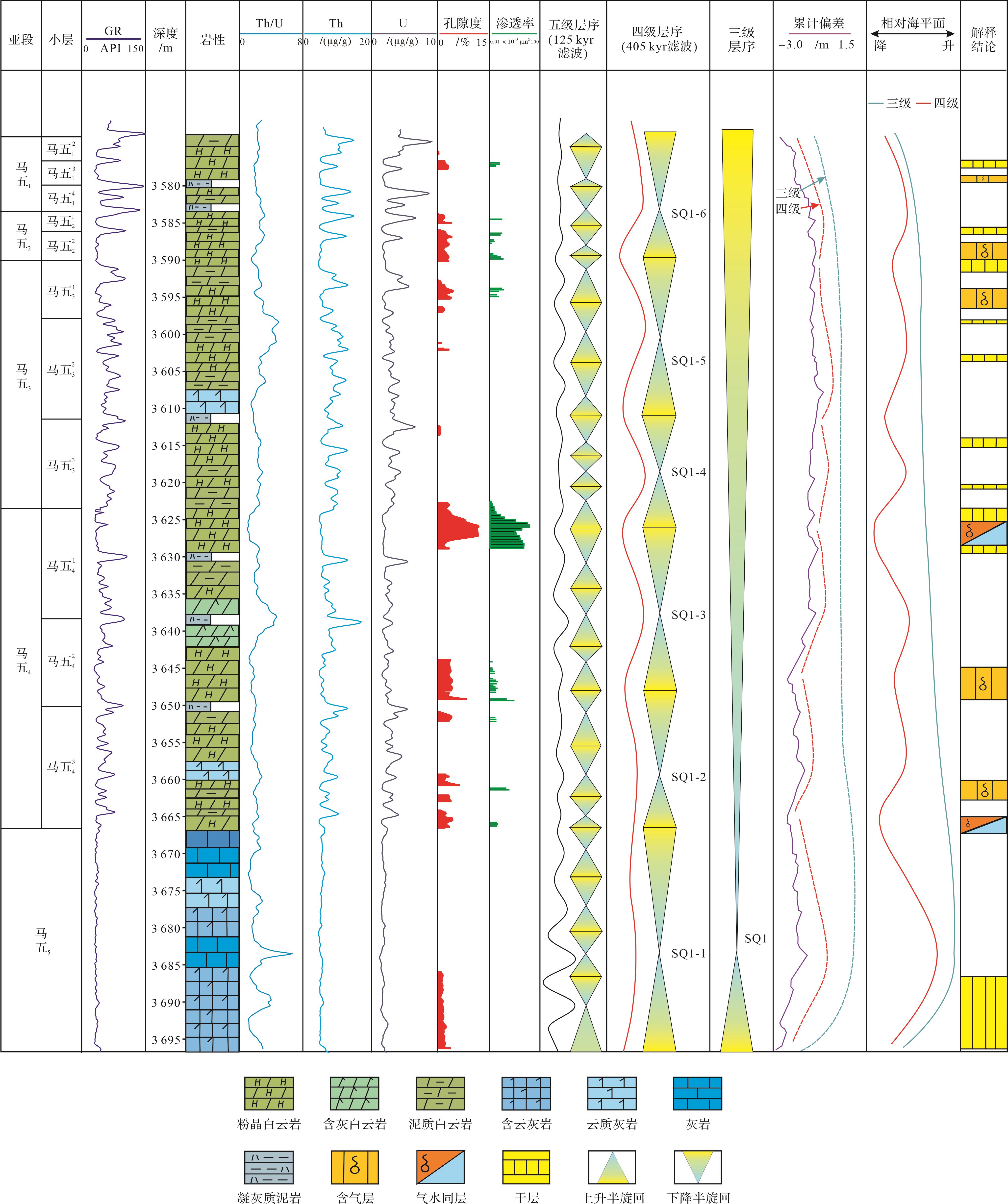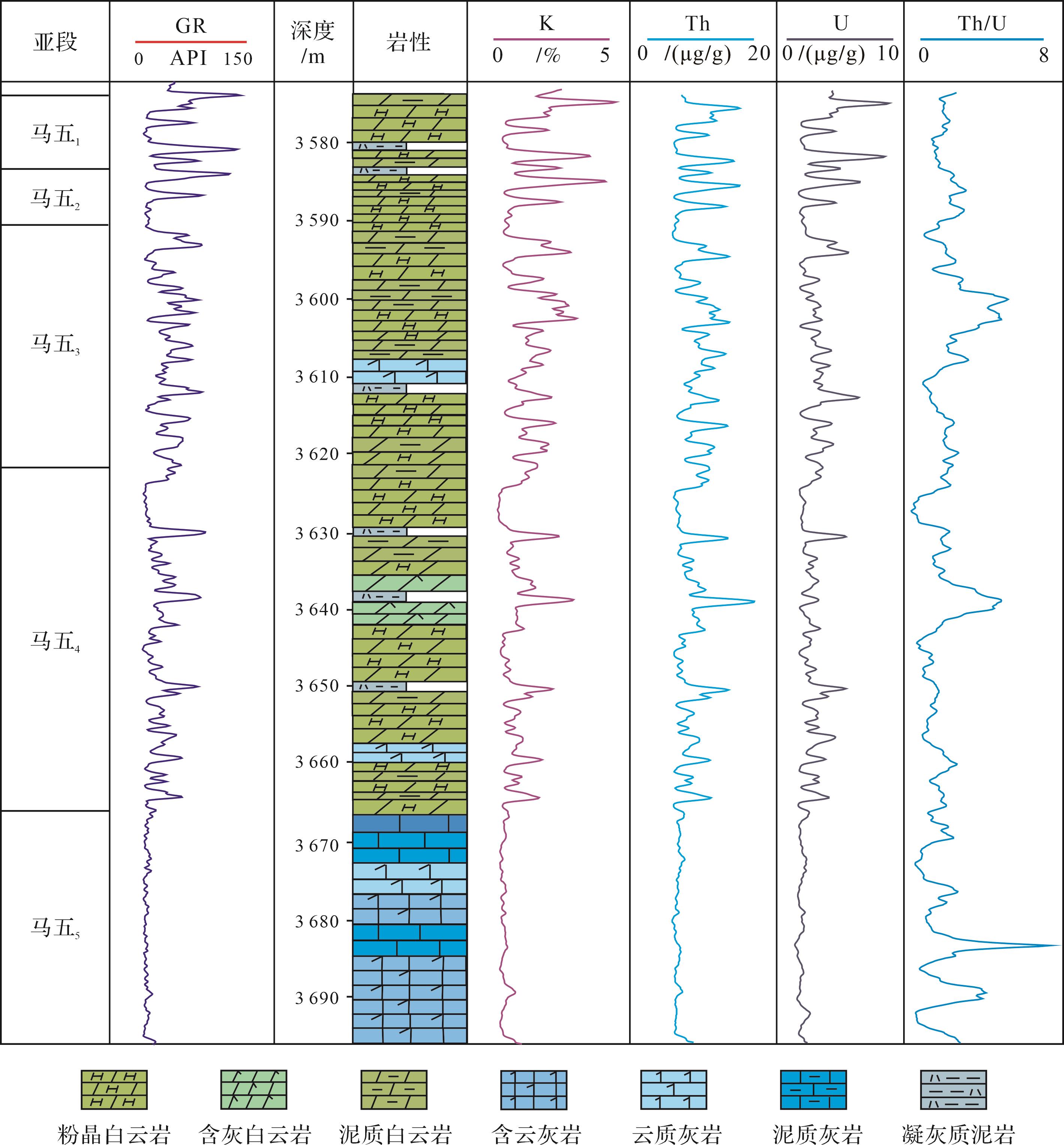 目的 探讨碳酸盐岩地层中高频层序划分及高频沉积旋回的控储效应。 方法 选取鄂尔多斯盆地桃7区块马家沟组马五1-5亚段,以自然伽马能谱测井中Th/U比值曲线为指示曲线,频谱分析结合Fischer图解和岩性组合序列,定量划分高频层序。 结果 碳酸盐岩地层中,自然伽马能谱测井中Th/U比值能够作为天文轨道间接替代指标,通过频谱分析结合Fischer图解、岩性岩相分析等定量加定性的分析方法可以有效划分高频层序。桃7区块马五1-5亚段可划分1个三级层序、6个四级层序,20个五级层序,经估算马五1-5亚段纵向上平均沉积速率约束为5.03 cm/kyr,沉积时限约为2.43 Ma。潮坪相向上变浅的高频沉积旋回顶部,即潮间带上部含膏粉晶白云岩,是储层发育的优势相带;四级高频层序界面附近是储集层发育有利层段。海平面频繁变化引起的早期岩溶作用,是马五1-4亚段溶模孔形成的主要动力,为后期表生期岩溶奠定了基础。 结论 碳酸盐岩地层中高频层序定量识别和划分对储集层预测具有重要指导意义。