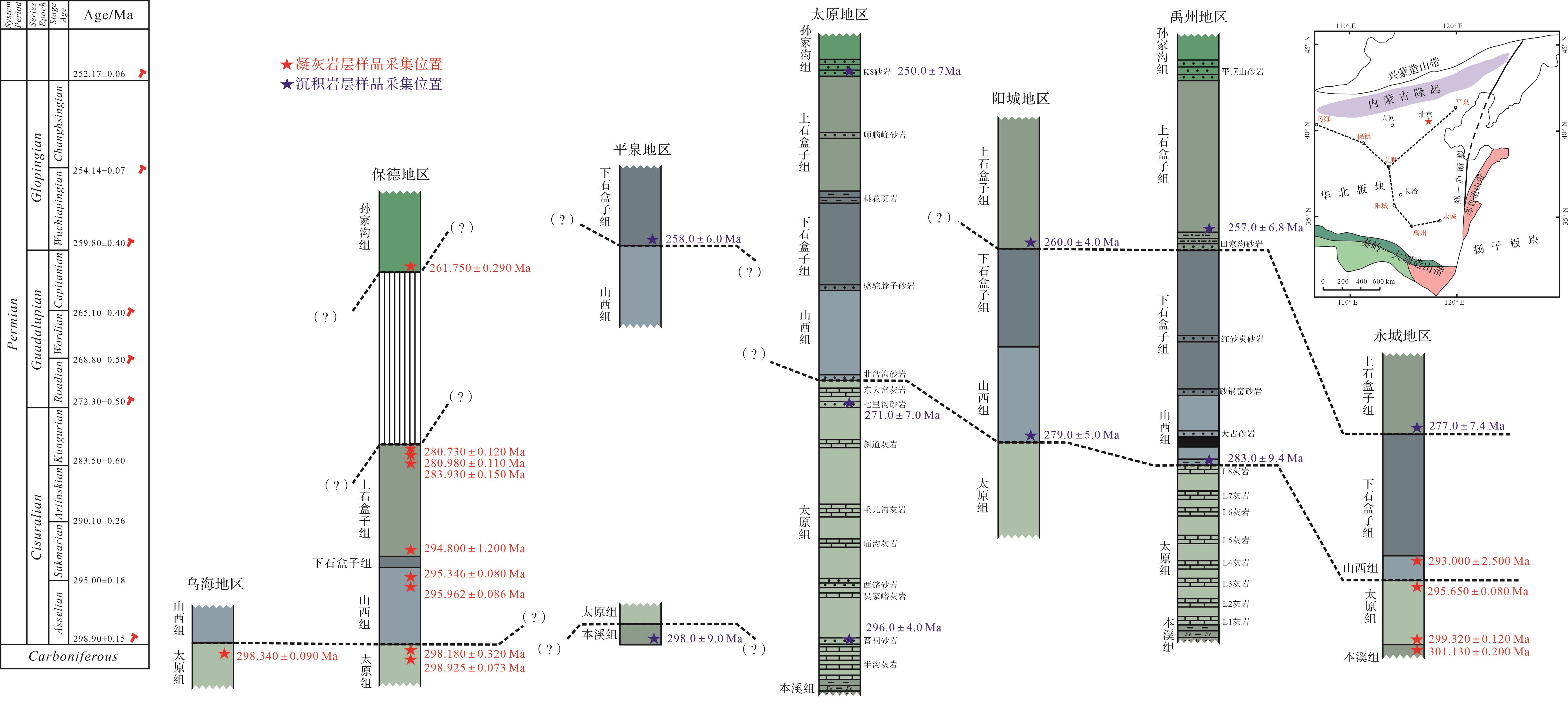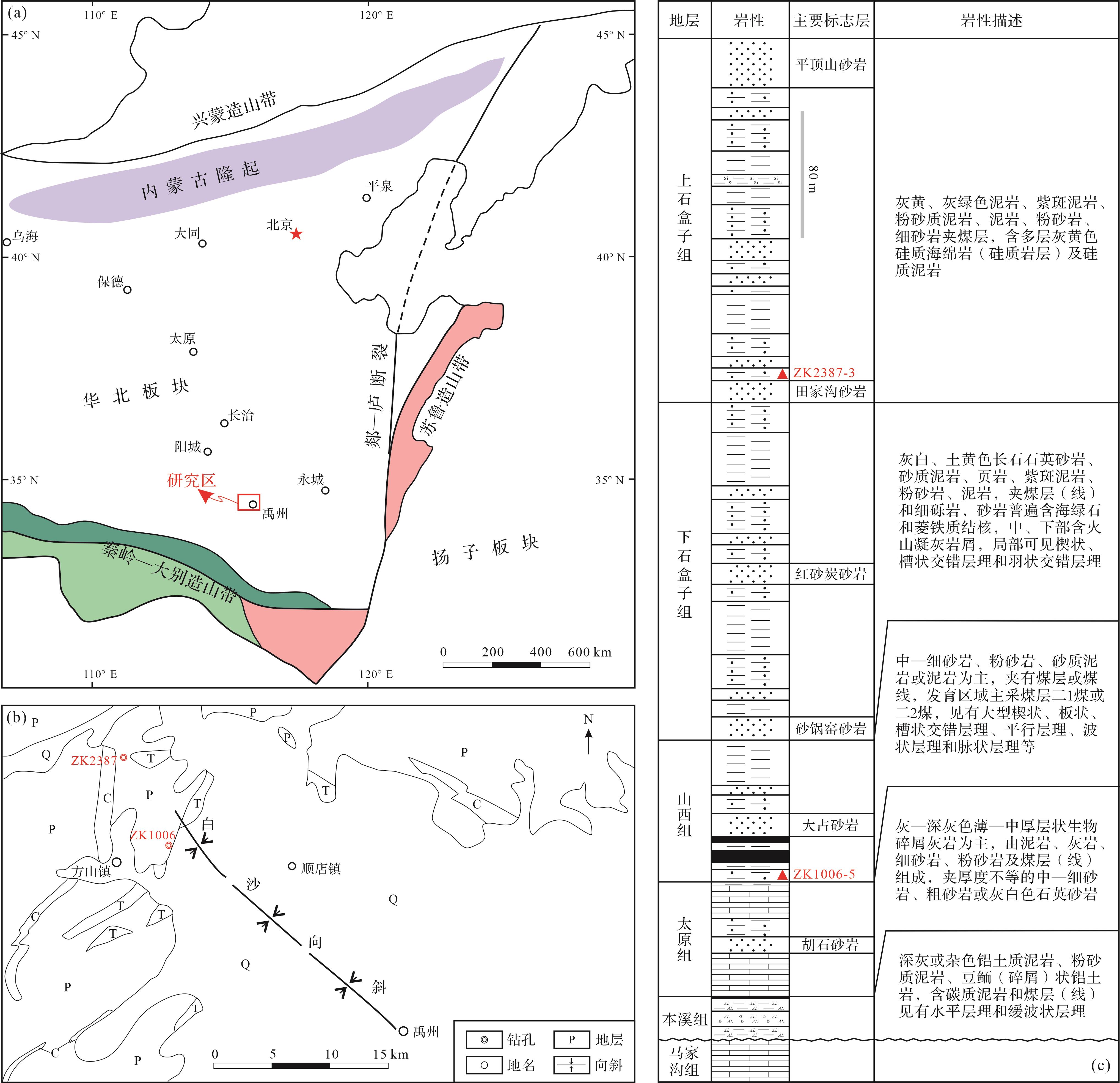 目的 禹州地区是华北板块南部上古生界含煤地层研究程度最高的地区,具有丰富的沉积学和地层古生物学研究基础,但由于缺乏绝对年代学数据而影响了年代地层划分及区域上大尺度的地层对比。 方法 选取禹州地区太原组与山西组、下石盒子组与上石盒子组地层界线附近的两件泥岩样品,通过碎屑锆石LA-ICP-MS U-Pb定年测试技术,确定它们的地层最大沉积年龄。 结果 数据表明:(1)山西组底部样品(ZK1006-5)的40颗碎屑锆石构成了283~343 Ma的连续年轻组分频谱,其最年轻单颗粒锆石年龄(YSG年龄)为283±9.4 Ma;上石盒子组底部样品(ZK2387-3)的18颗碎屑锆石构成了257~299 Ma的连续年轻组分频谱,其最年轻单颗粒锆石年龄(YSG年龄)为257±6.8 Ma;其分别可代表样品地层最大沉积年龄,表明沉积时间不早于283±9.4 Ma和257±6.8 Ma;(2)禹州地区山西组、上石盒子组沉积分别开始于空谷期(Kungurian)和吴家坪期(Wuchiapingian),与区域生物地层资料研究相一致;(3)华北板块上古生界含煤地层岩石地层穿时明显,且跨度较大,整体表现为由板块边缘向内部逐渐穿时变新。 结论 综合前人对华北晚古生代盆地火山事件沉积相关研究,认为同沉积期盆地东缘活动强烈,其诱发的岩浆活动、构造活动、生物演替和海侵作用可能与同时期逐渐形成劳亚古大陆有关。