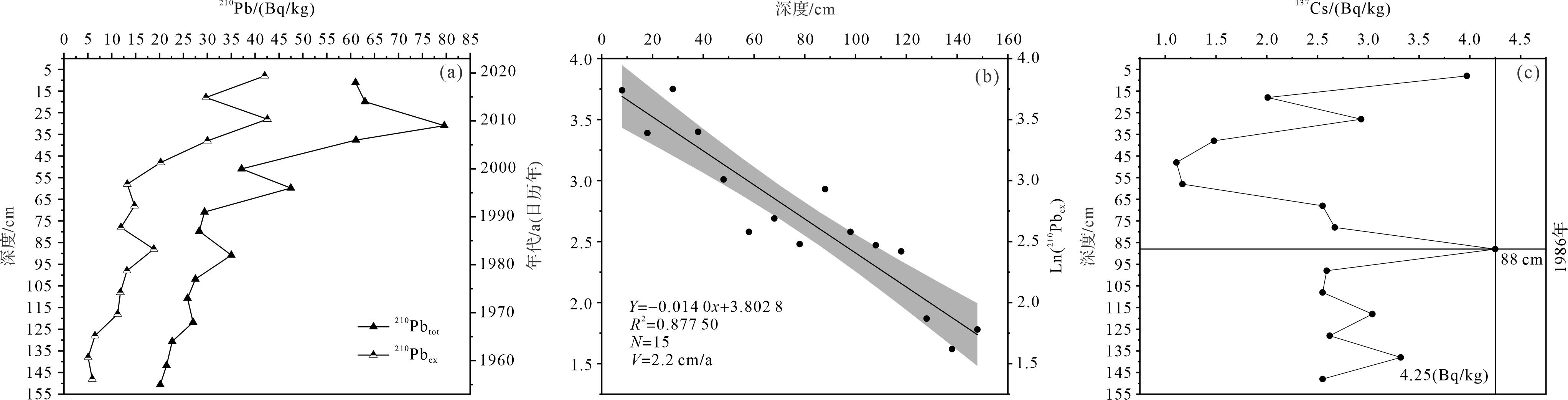 图  1  柱状沉积物210Pb、137Cs测年的垂向分布