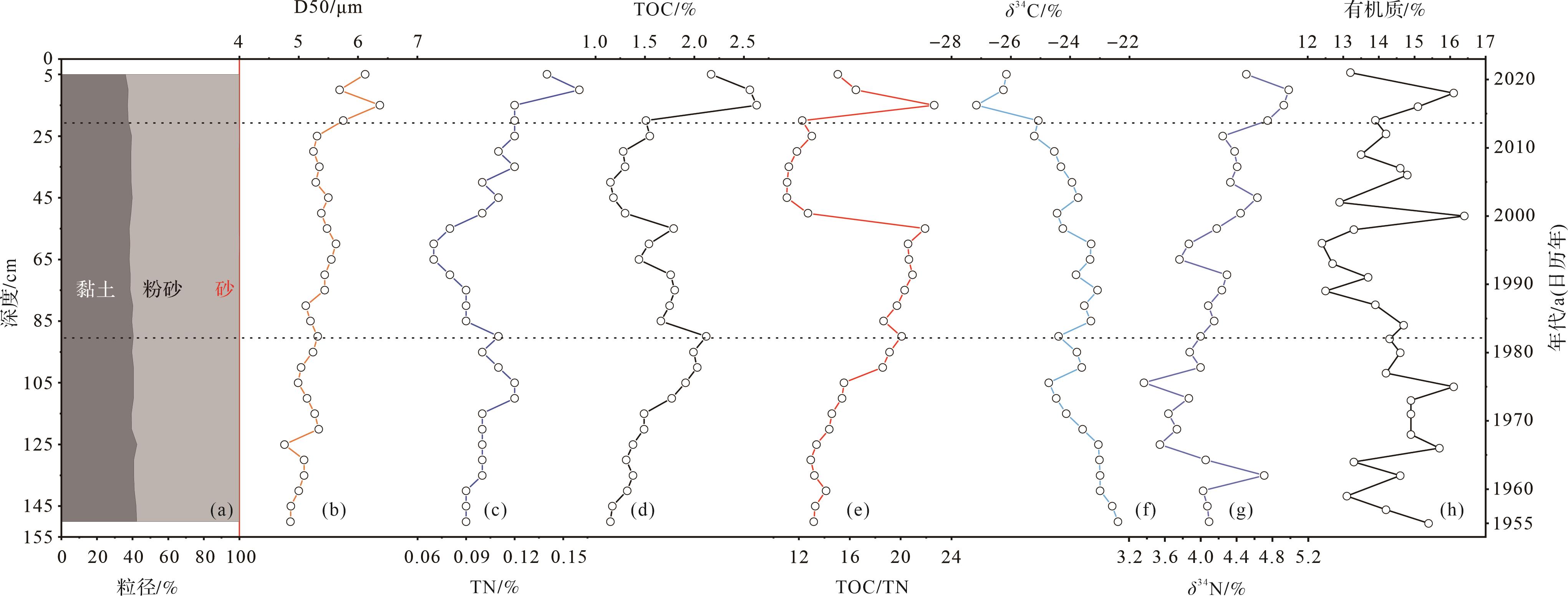 柱状沉积物粒度组分和D50随深度变化基本保持不变,其中,D50是沉积物粒度组成的重要参数,反映沉积物整体粒度含量变化情况[23],故沉积环境较为稳定。值得注意的是,在1966年前后D50明显减小,表明河流的输沙量可能发生了变化。1965年前后,沿浦河上游水闸(27°13′45.53″ N,120°27′24.14″ E)投入使用,其拦截作用使得上游输沙量减少,导致沉积物中不同粒径的颗粒比例发生变化,从而导致沉积物D50变小,黏土组分含量增加至最大值(42.51%)。然而,在2013年前后沉积物D50明显增大,这主要是受台风影响。2013年10月7日,台风“菲特”在沙埕港沿岸登陆,沿浦湾内及周边河流水动力极大增强,水体的冲刷与流失过程导致沉积物表层的细颗粒物质流失并进入水体,故沉积物粒径出现粗化。在此之后D50变小可能是因为河口水闸(27°13′10.67″ N,120°27′26.31″ E)以及老鼠尾防波堤(27°10′0.52″ N,120°27′29.44″ E)投入使用,造成水体水动力条件减弱,水体中大量悬浮颗粒沉降到河滩表层,沉积物粒径出现迅速细化,沉积物粒度组分中黏土、粉砂含量增大。因此,极端天气和水利工程建设可能是影响红树林沉积物粒度组成的重要因素,进而影响沉积物有机碳埋藏通量。