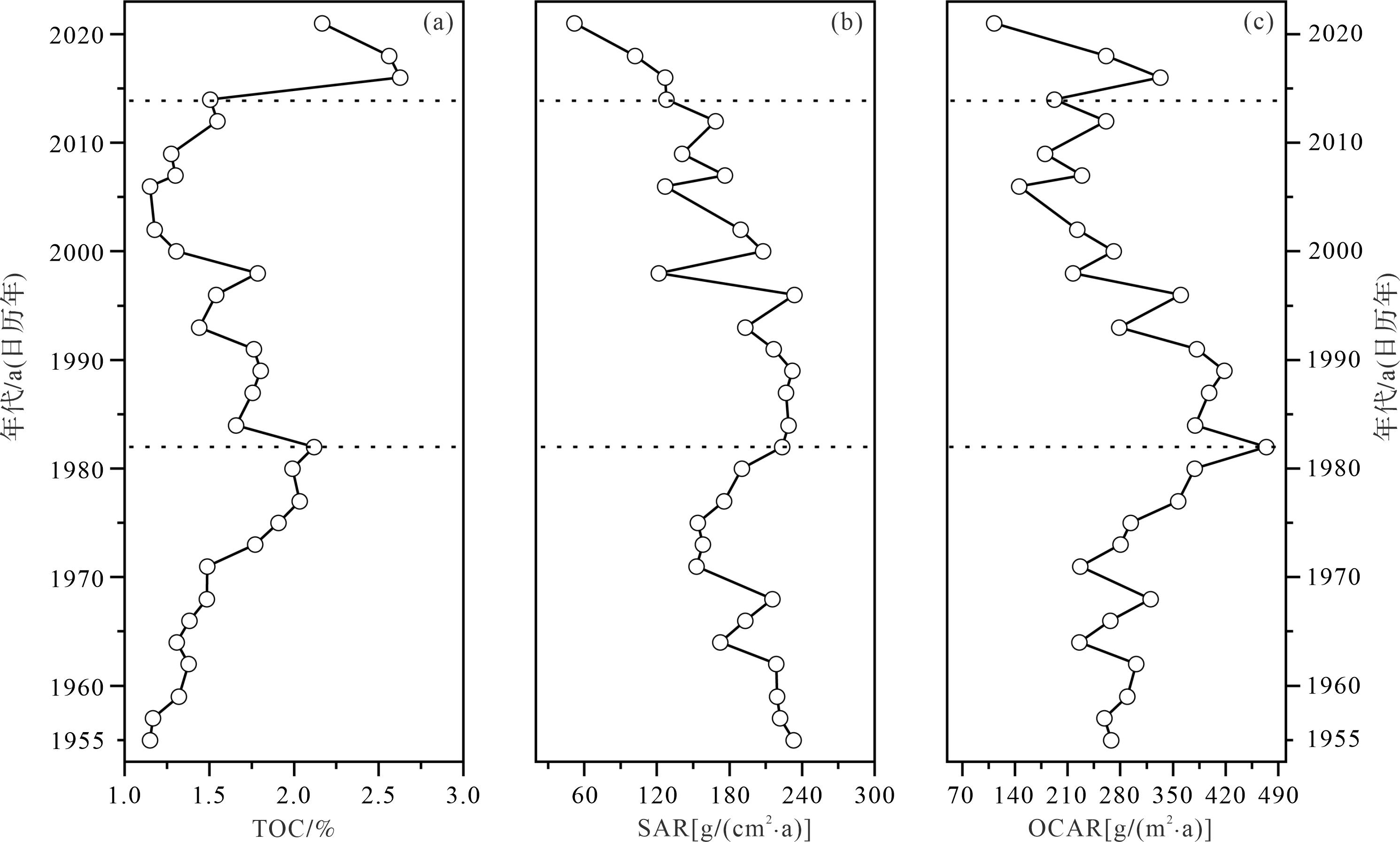 • 红树林柱状沉积物SAR值介于52.03~233.61 g/(cm2·a),平均值为177.68 g/(cm2·a)(图4b),沉积物OCAR值介于112.78~473.97 g/(m2·a),平均值为286.65 g/(m2·a)(图4c)。根据TOC、SAR和OCAR随时间变化的趋势(图4a~c),可将有机碳的沉积记录分为三个阶段:(1)第一阶段为1955—1982年,这一阶段TOC含量与OCAR整体呈上升趋势,SAR最小值为152.74 g/(cm2·a),最大值为233.01 g/(cm2·a),OCAR出现最大值473.97 g/(m2·a);(2)第二阶段为1982—2014年,主要表现为TOC与OCAR整体呈下降的趋势,SAR从223.73 g/(cm2·a)下降到127.87 g/(cm2·a),OCAR也从473.97 g/(m2·a)下降到192.60 g/(m2·a);(3)第三阶段为2014—2021年,TOC与OCAR均呈先上升后下降的趋势,SAR呈下降趋势并出现最低值52.03 g/(cm2·a),OCAR出现最低值112.78 g/(m2·a)。TOC、OCAR无明显相关性(R2=0.095 78,图5a),SAR、OCAR显著性正相关(R2=0.457 66,图5b),表明红树林沉积物的SAR可能是沉积物有机碳埋藏的一个重要影响因素,较高的SAR有利于有机碳的沉积与埋藏。