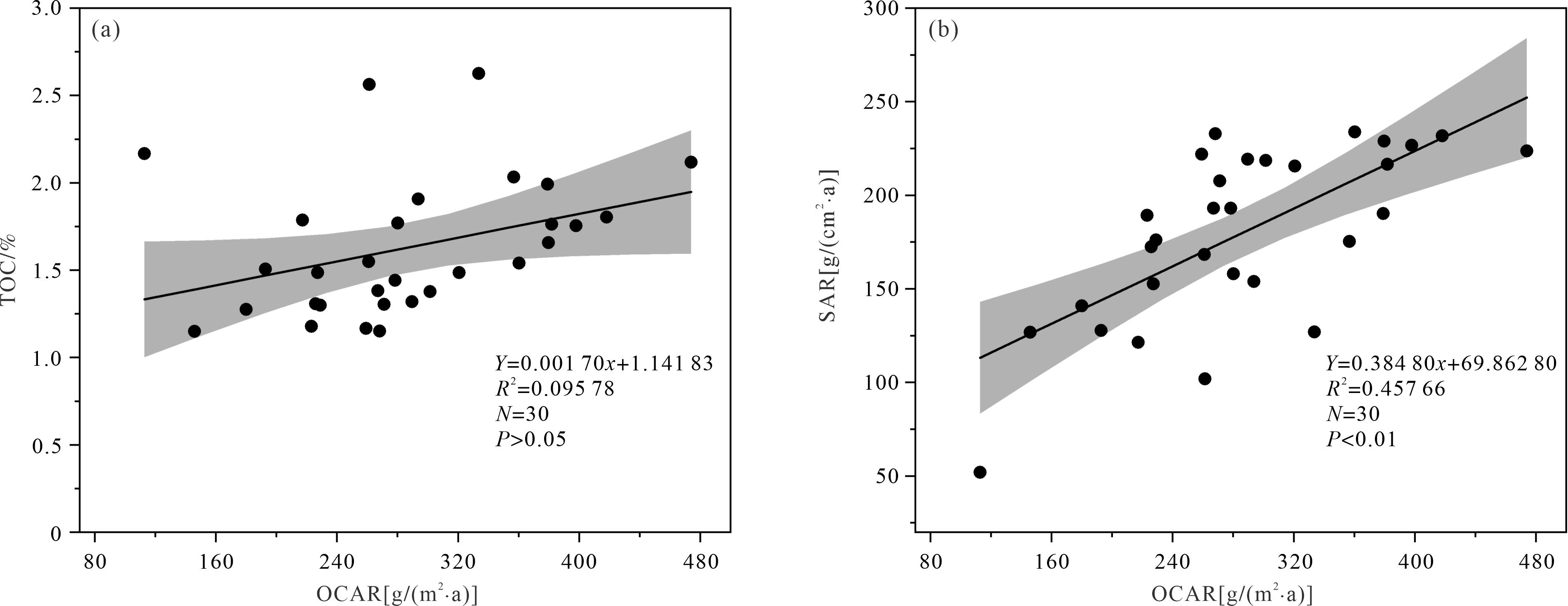 图  5  柱状沉积物中OCAR与TOC/SAR的相关关系