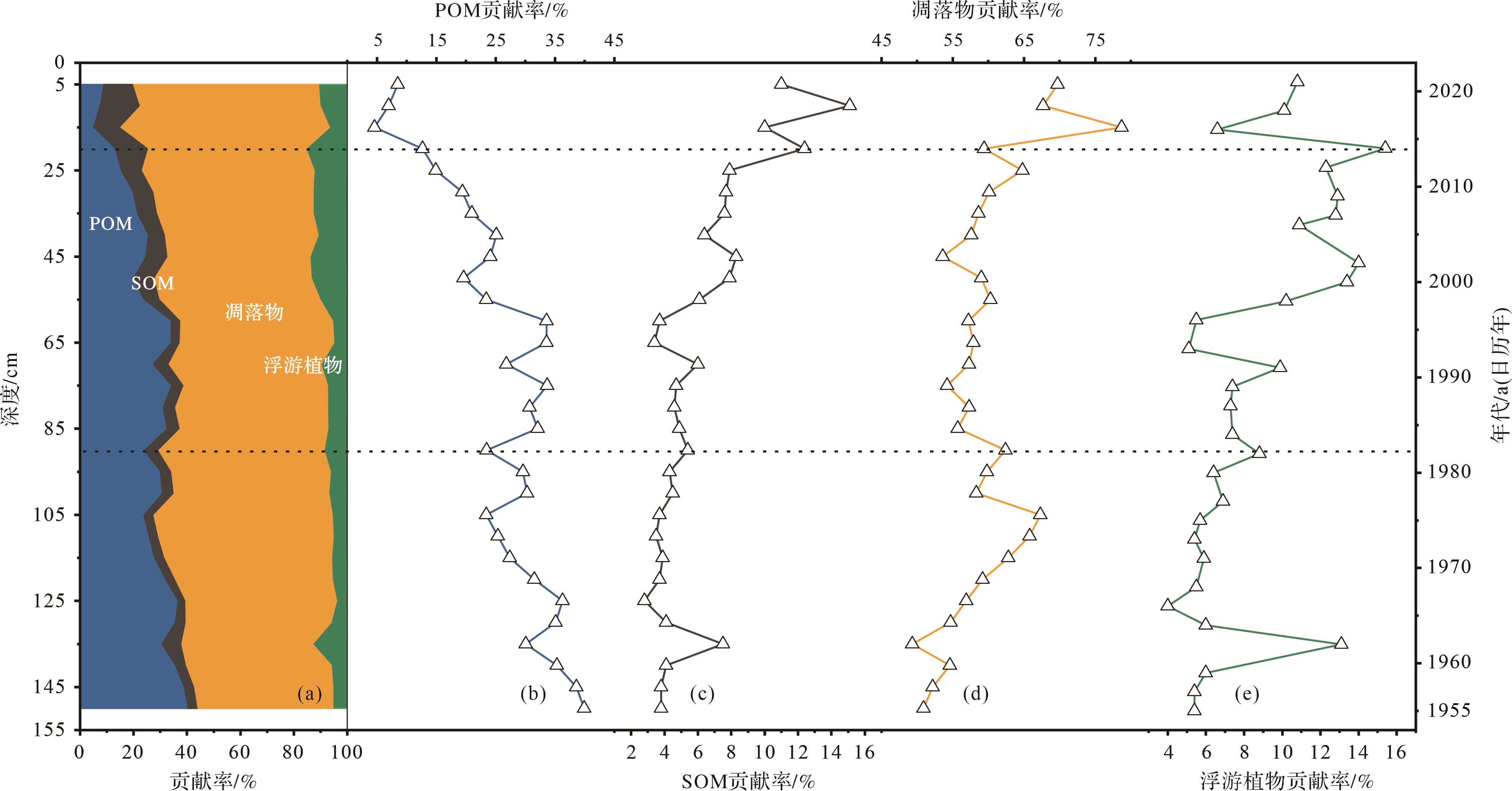 基于MixSIAR模型量化沉积物有机碳来源的贡献率发现,凋落物贡献率最大,介于49.30%~78.70%,平均值为59.44%(图7a,d);POM贡献率介于4.60%~39.90%,平均值为25.91%,POM的贡献率整体呈下降趋势(图7a,b);SOM的贡献率最小,介于2.80%~15.10%,平均值为6.09%(图7a,c);浮游植物的贡献率介于4.00%~15.40%,平均值为8.56%,SOM和浮游植物的贡献率整体呈增长趋势(图7a,c,e)。