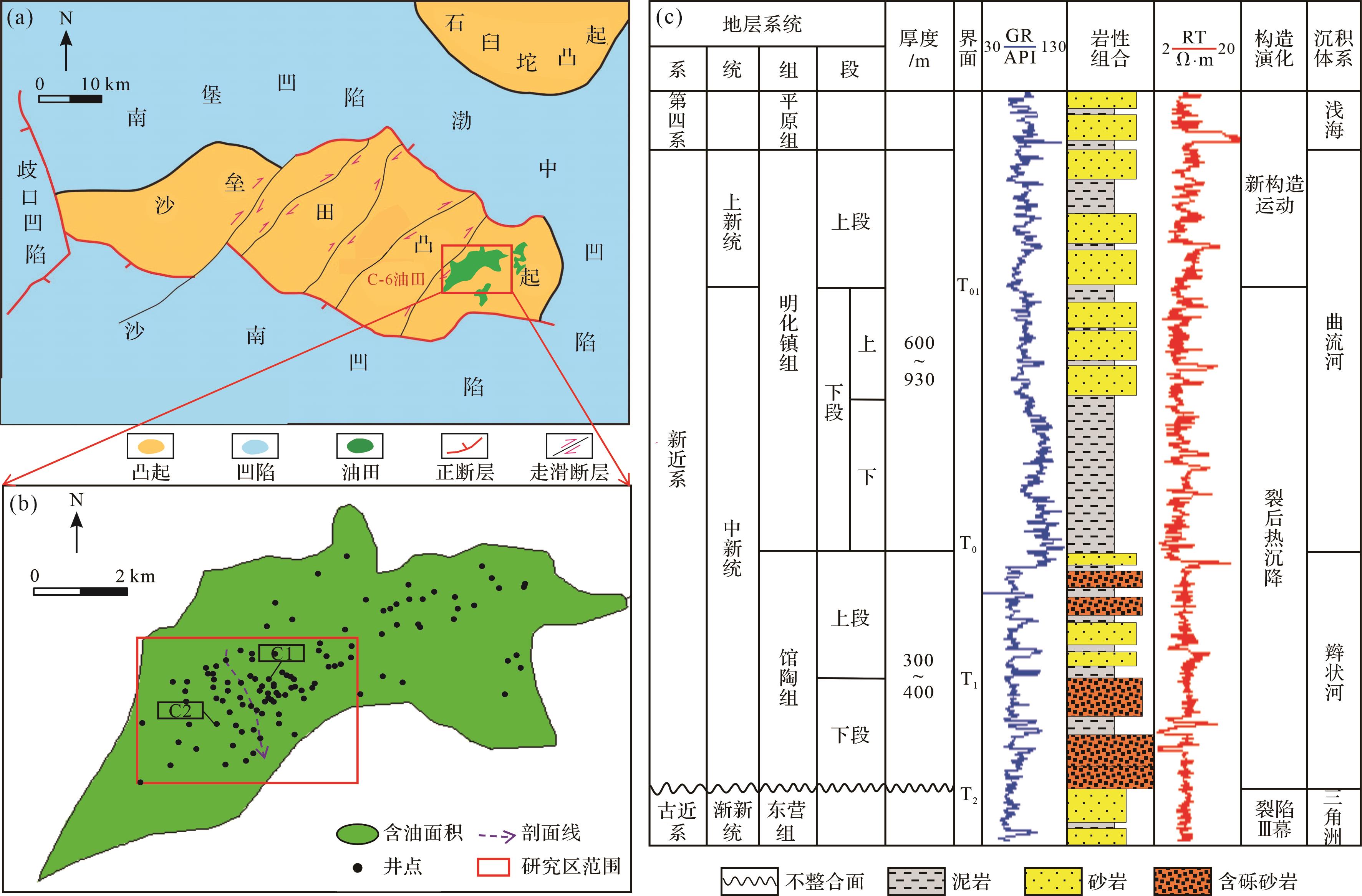 • 图  1  C⁃6油田构造位置及沙垒田凸起新近系综合柱状图