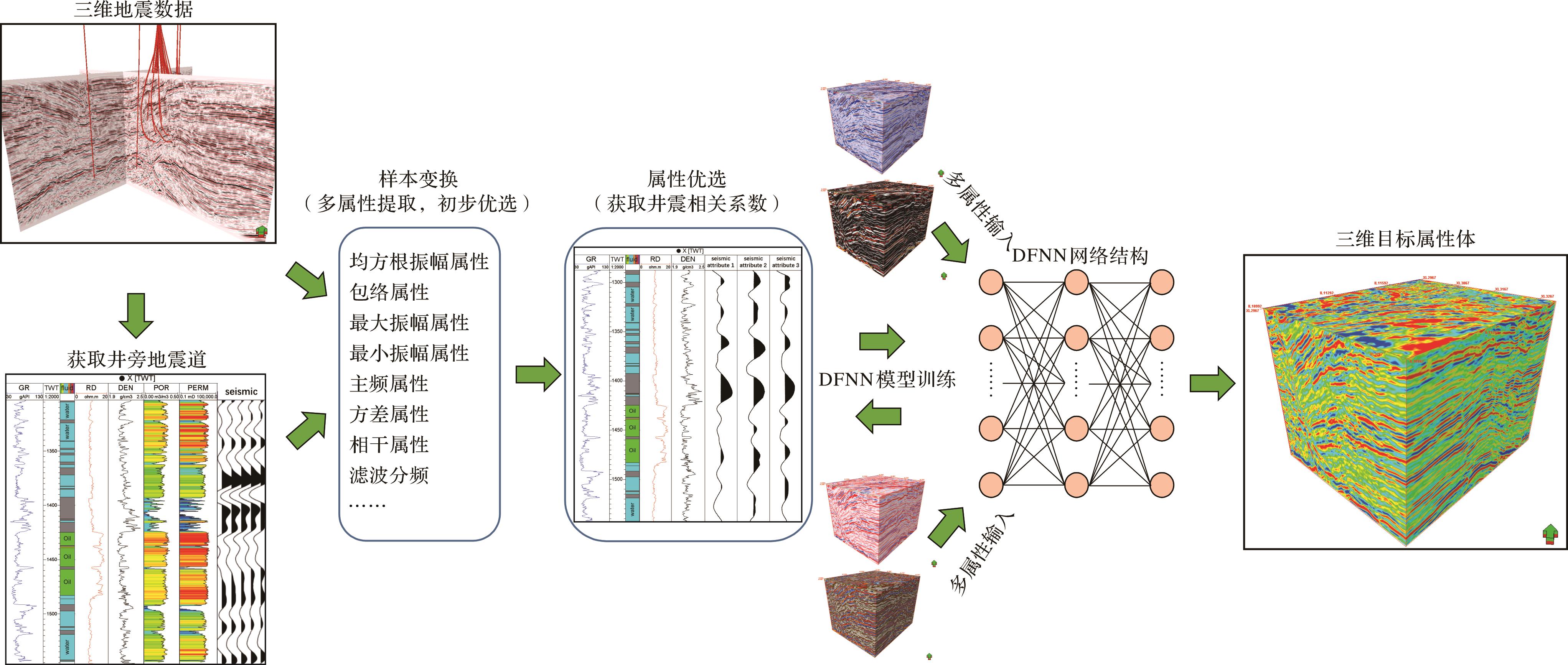 以工区内20口井的孔隙度曲线为目标函数,应用DFNN建立孔隙度与井旁道多种地震属性参数进行深度学习,通过多次迭代,建立起孔隙度与地震属性参数之间的非线性映射模型,继而将该非线性映射模型应用于工区的三维地震覆盖区,得到基于多种地震属性融合的孔隙度三维数据体,为井间储层构型单元边界探测提供资料基础。主要由样本构建、DFNN模型训练、DFNN模型应用三个方面(吴海波等,2014),具体流程如图3所示。