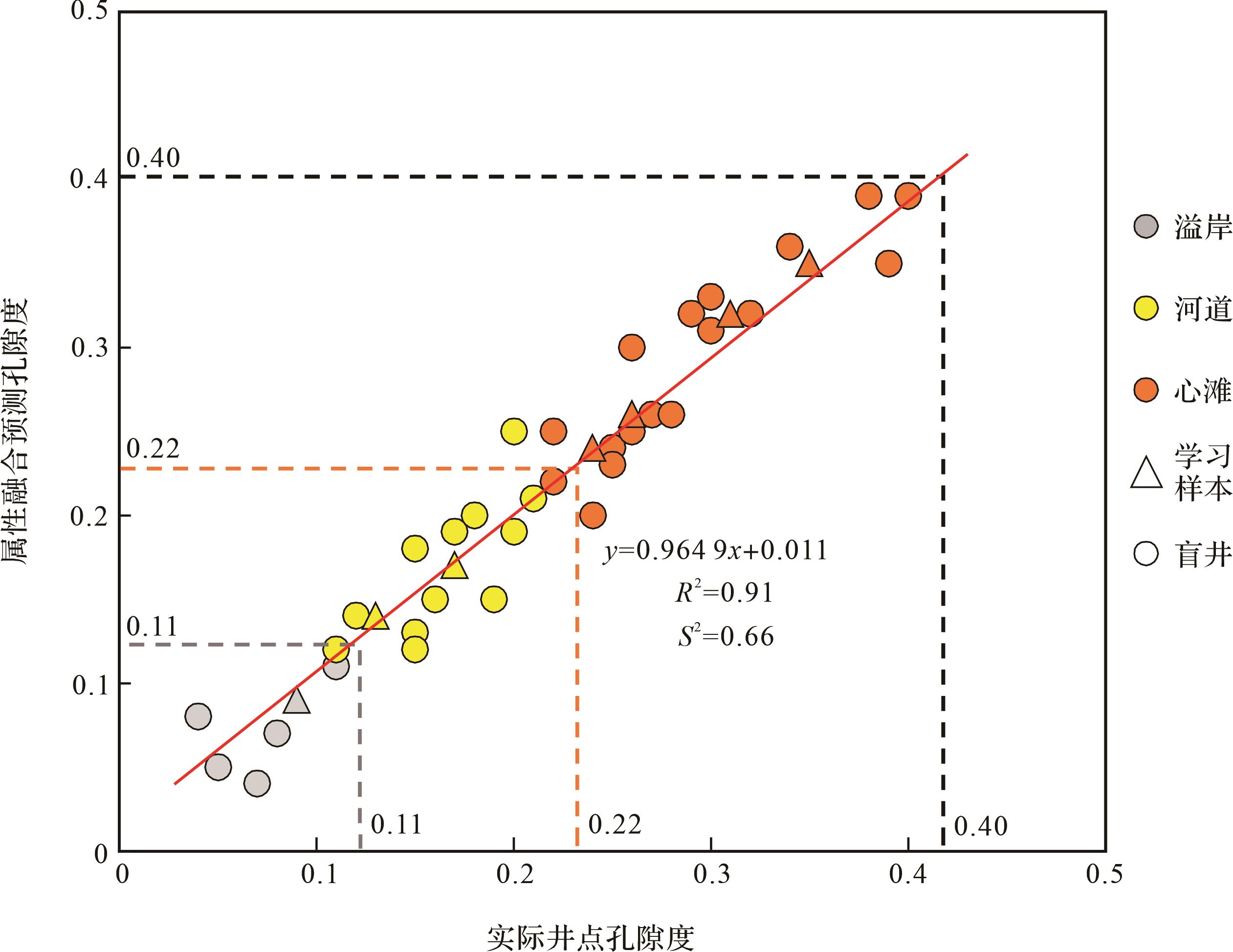 针对融合属性效果的好坏评判,选取拟合优度(R2)和方差(S2)一起作为预测结果准确性的评价参数,拟合优度越接近于1,方差越接近0,则表明模型预测效果越好。经过交会图的数学分析,井点多属性融合预测与实际孔隙度的R2为0.91,S2为0.66(图6),预测结果表明,基于DFNN多属性融合提高了储层预测的精度和可信度。通过交会图也能够体现出溢岸沉积与辫状河道孔隙度阈值为0.11,辫状河道和心滩之间孔隙度阈值为0.22(图6)。