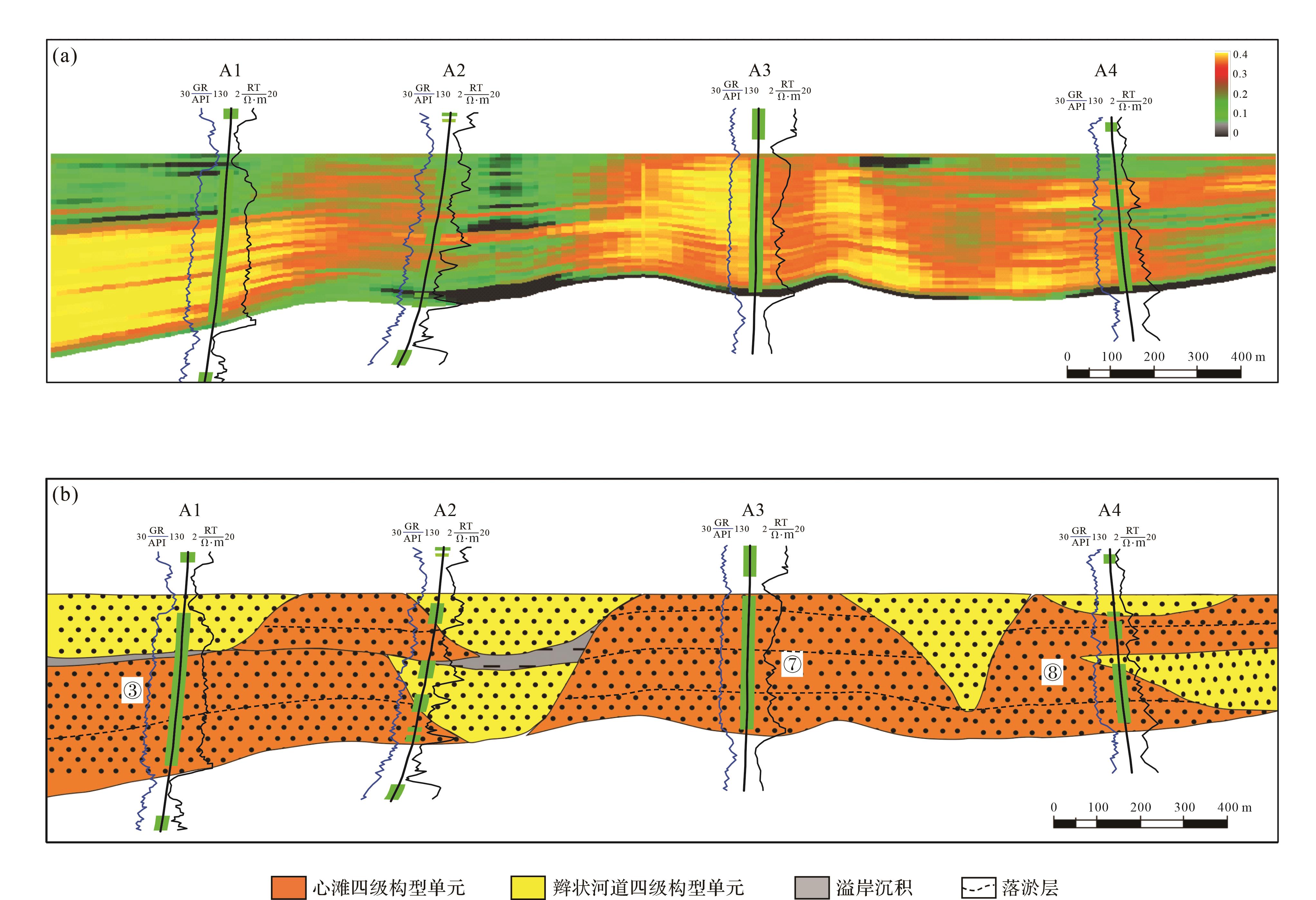 根据切物源属性融合剖面上的高值区以及属性值的边界形态(图8a),在2小层解释出3个心滩四级构型单元(③、⑦、⑧),心滩和分流河道构型单元的拼接界面影响连通,在心滩⑦和心滩⑧之上发育辫状河道四级构型单元(图8b)。心滩内部或边缘的分流河道规模小,未下切至心滩底部,形成“大心滩上小河道”的样式,根据井上厚砂体内部发育的隔夹层,按照辫状河心滩沉积模式解释为落淤层,在垂向上可造成同一单砂体内部上下位置水淹程度的差别。1小层发育2个孤立的心滩,整体较2小层心滩规模小,同时1小层发育数个小规模辫状河道。