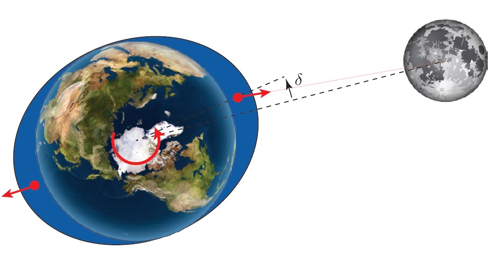 月球在地球上产生潮汐隆起,但由于地球在进行自转,就导致潮汐隆起略微偏离地球-月球引力方向(角度δ)。这会产生制动扭矩,减缓地球的自转,由于地月系统中的角动量守恒,月球将会远离地球。