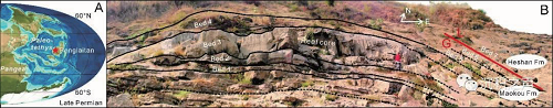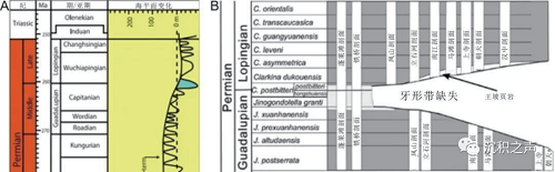 图1A)全球海平面变化图指示中·晚二叠世之交全球发生了显生宙最大的海退事件。B)Guadalupian-Lopingian 时期华南地区多数剖面存在沉积间断(通常缺失几个牙形石)(Yuan et al,2017)