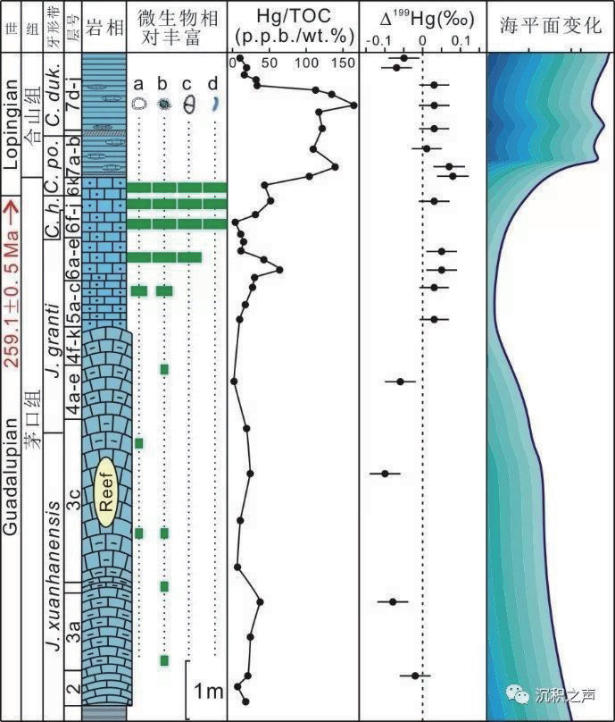 在地质历史时期,巨量大气沉降汞主要由大型火山爆发所致,因此可以用汞元素和汞同位素地球化学来示踪大型火山事件。在我国西南地区,以今天的峨眉山地区为中心覆盖着超过30万立方公里的玄武岩(峨眉山大火成岩省),静静的向我们展示着一场超级大火成岩省强烈爆发后留下的产物,科学家通过放射性同位素测试年龄的方法将这次大型超级火山爆发的时间厘定到Guadalupian末期(Zhong et al,2014),与蓬莱滩剖面上所记录的汞地球化学指标的波动时间一致。因此,蓬莱滩剖面记录的汞地球化学指标的波动很可能是由峨眉山大火成岩省强烈喷发而发引起的。同时,通过元素地球化学指标计算出来的大陆风化指标(CIA)明显增强,说明在Guadalupian末期火山爆发造成的温度突变、陆地风化增强、陆源营养物质输入增加,导致了海水强烈富营养化。此外,多硫同位素分析也显示缺氧海水在此时也频繁经过上升流从深水水域上升至浅水水域(Zhang et al,2015),污染浅水生态环境,从而刺激了微生物在蓬莱剖面的第5-6层中爆发,导致海洋环境进一步恶化,再加上大海退引起的海平面下降,这些因素共同导致了生物礁的全面坍塌,同时部分底栖生物(如,腕足类、巨型双壳等)也随之消失(图5)。