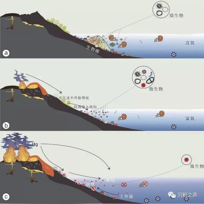 图5卡通图示意火山作用(峨眉山大火成岩省喷发)与微生物爆发和生物礁坍塌、底栖生物灭绝的关系。a)灭绝前繁盛的生物礁生态系;b)海平面下降及海洋环境恶化导致生物礁瓦解,微生物开始繁盛;c)大规模火山爆发造成底栖生物的消失及部分游泳类型生物的灭绝