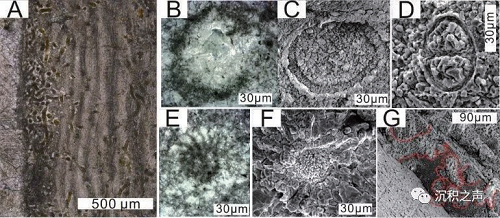 图3.在生物礁上部以及上覆地层中爆发式出现的形态各异的微生物(菌藻类)