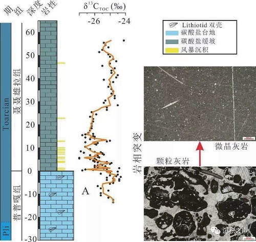 然而,好景不长,一场猛烈的突发性灾难降临了,Toarcian早期(~183 Ma)地球快速升温导致这群生物的生存环境急剧恶化而发生灭绝。在特提斯喜马拉雅地区,在Toarcian早期,碳酸盐岩微相(沉积学和古生物学的特征总和)结果显示富含底栖生物的颗粒灰岩突变为无生物化石的微晶灰岩(图6),沉积古水深突然增加,沉积环境由浅水碳酸盐镶边台地(0-10m)突变为较深水的碳酸盐缓坡(40-70m)。这种改变使得浅海生态系统崩溃,浅水碳酸盐台地的Litiotis 双壳及其共生的珊瑚、有孔虫、腹足等发生绝灭,碳酸盐台地的生产速率下降,相对海平面上升速率超过碳酸盐堆积速率,碳酸盐台地没入富产碳酸盐的透光带(水深<10米)以下,进一步降低台地的碳酸盐生产速率,从而碳酸盐台地发生淹没(图6)。同时,有机碳同位素发生剧烈负偏移(2.5%。),与此次环境变化完全吻合。在双壳Lithiotis 确定大致层位的基础上,我们结合沉积学和碳同位素地层学两方面的证据厘定了Toarcian大洋缺氧事件在特提斯喜马拉雅的准确层位,首次在南半球热带/亚热带开放碳酸盐台地环境下追踪到Toarcian期大洋缺氧事件的记录。