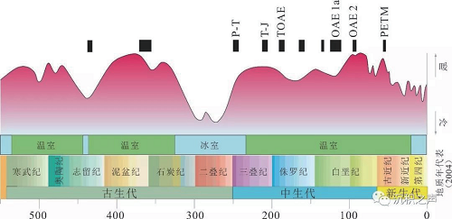 P-T∶二叠纪-三叠纪界线事件、T-J∶三叠纪-侏罗纪界线事件、TOAE∶早侏罗世Toarcian期大洋缺氧事件、OAE 1a∶白垩纪Aptian早期大洋缺氧事件、OAE 2∶Cenomanian末期大洋缺氧事件、PETM∶ Paleocene-Eocene极热事件