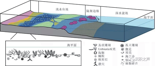 浅水台地内部发育丰富Lithiotis双壳、底栖生物组合和碳酸盐颗粒,修改自Brame et al.