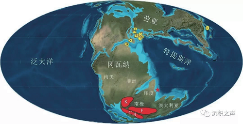 读到这里,大家肯定不禁要问,地球为什么在这个时候突然快速升温呢?目前主要有两种假说∶(1)当时位于冈瓦纳大陆南缘的Karo-Ferrar 大火成岩省(图3,~200万平方公里,现今主要残留在南非、澳大利亚东南部和南极洲)在超级大陆裂解的过程中剧烈喷发,该过程中释放大量幔源CO2到海洋-大气系统中,同时岩浆还侵入富含有机质的地层,又引起热分解成因的CH4和CO2叠加释放;(2)大陆架边缘沉积物中甲烷水合物的分解。这两种假说都认为海洋-大气系统中CH4和CO2等温室气体浓度迅速升高是地球发烧的罪魁祸首,并引起一系列灾难性的环境和气候变化,包括全球快速增温、热带风暴频率明显增加、海平面上升、大洋酸化、风化作用增强、营养物质输入增加和大洋缺氧等,最终发生重大生物危机,浅海生态系统彻底崩溃。