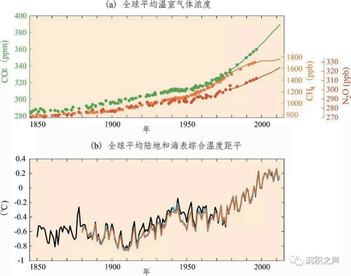 图1全球温室气体浓度与年平均温度距平图(IPCC,2014)