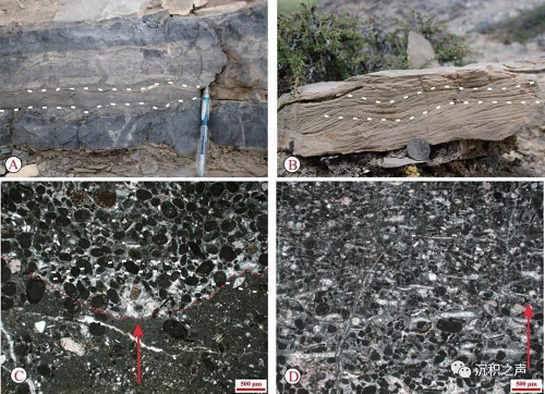 图7西藏特提斯喜马拉雅野外(A、B)和显微镜下(C、D)典型风暴相关沉积构造,风暴沉积