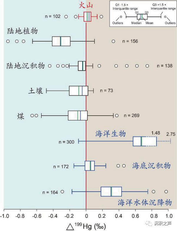 图2汞奇数非质量分馏(△199Hg)在陆地、海洋、和火山来源的值(来源Shen et al.,2019a)