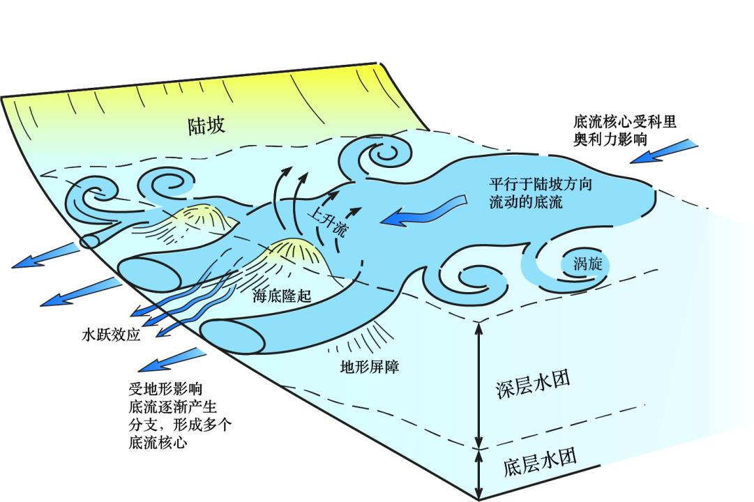 在海洋深处,隐藏着一股股由密度驱动、缓慢而持久的水流,该类型水流通常被称为底流(bottom current)。不同于短暂而剧烈的海底浊流,底流宛如一位耐心的“地质雕刻家”,以较低的速度沿海底地形流动,当其遇到海底隆起等地形障碍时,可形成上升流,并逐渐分叉,演化出多个流速较快的底流核心(图1),历经千万年,深刻塑造深海地貌(Rebesco et al., 2014)。底流的深层驱动力源自海水的温度和盐度差异(即温盐环流),犹如地球的“血液循环系统”,在全球范围内输送热量与物质。虽流速缓慢,却因持久稳定,在漫长地质年代里雕刻出独特的海底沉积结构。近三十年来,科学家发现,底流沉积物如同深海的“历史档案”,记录着古海洋流速变化、洋流路径迁移等关键信息。通过研究这些沉积物,科学家得以解码地球历史上洋流格局演变、气候剧变及板块运动的奥秘。