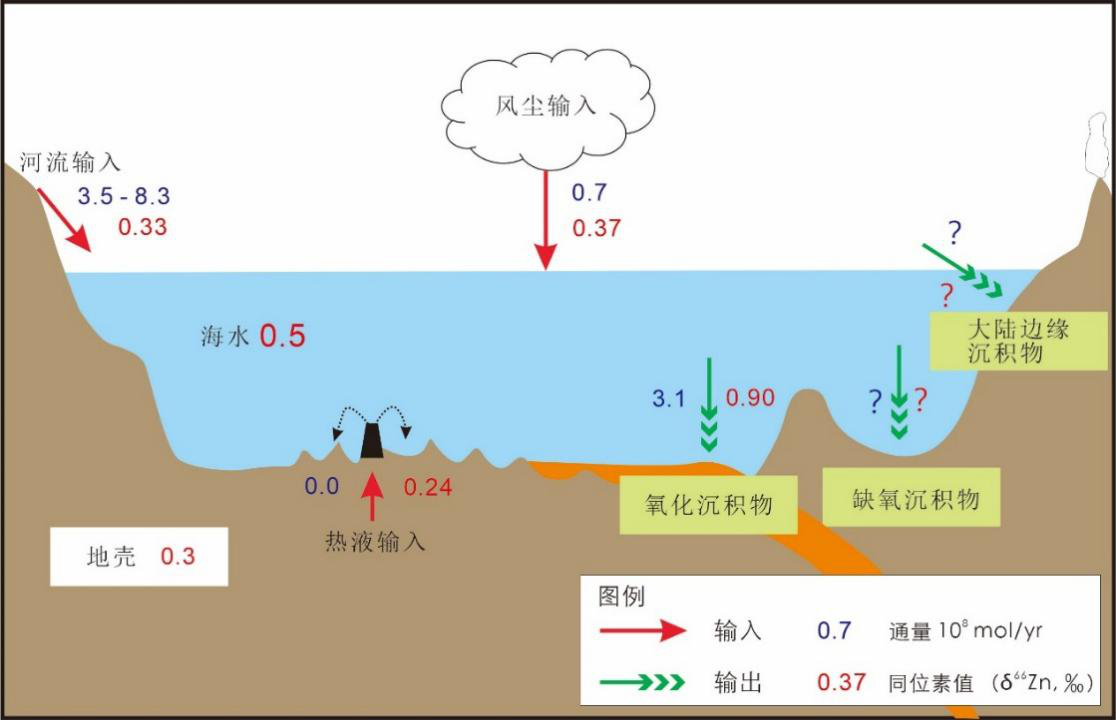 海洋输出的Zn,在铁锰结核和碳酸盐沉积物中其δ66Zn值均在0.90‰左右。Little等(2016)文章发表之前,对于海洋中Zn的质量平衡存在较大的疑问。因为上述海水输出的δ66Zn值,比输入到海水中的δ66Zn值高2倍。理论上,这会导致海水的δ66Zn值低于输入值,即<0.3‰。如果要使得海水δ66Zn值达到实测值0.5‰,则可能是某一富含重同位素输入源未发现,亦或是海水向外输出了大量轻的Zn元素。Little等(2016)通过对太平洋东岸的加利福尼亚、墨西哥和秘鲁大陆边缘富有机质沉积物开展Zn同位素测试,发现前两者δ66Zn值<0.2‰,后者在0.3-0.4‰之间。大陆边缘富有机质沉积物中δ66Zn值低,其原因是生物在摄取营养元素Zn时,优先吸收轻的同位素,导致海水中的δ66Zn值增加。这种生物分馏作用,可以解释海水储库中δ66Zn值高于其输入值的现象。