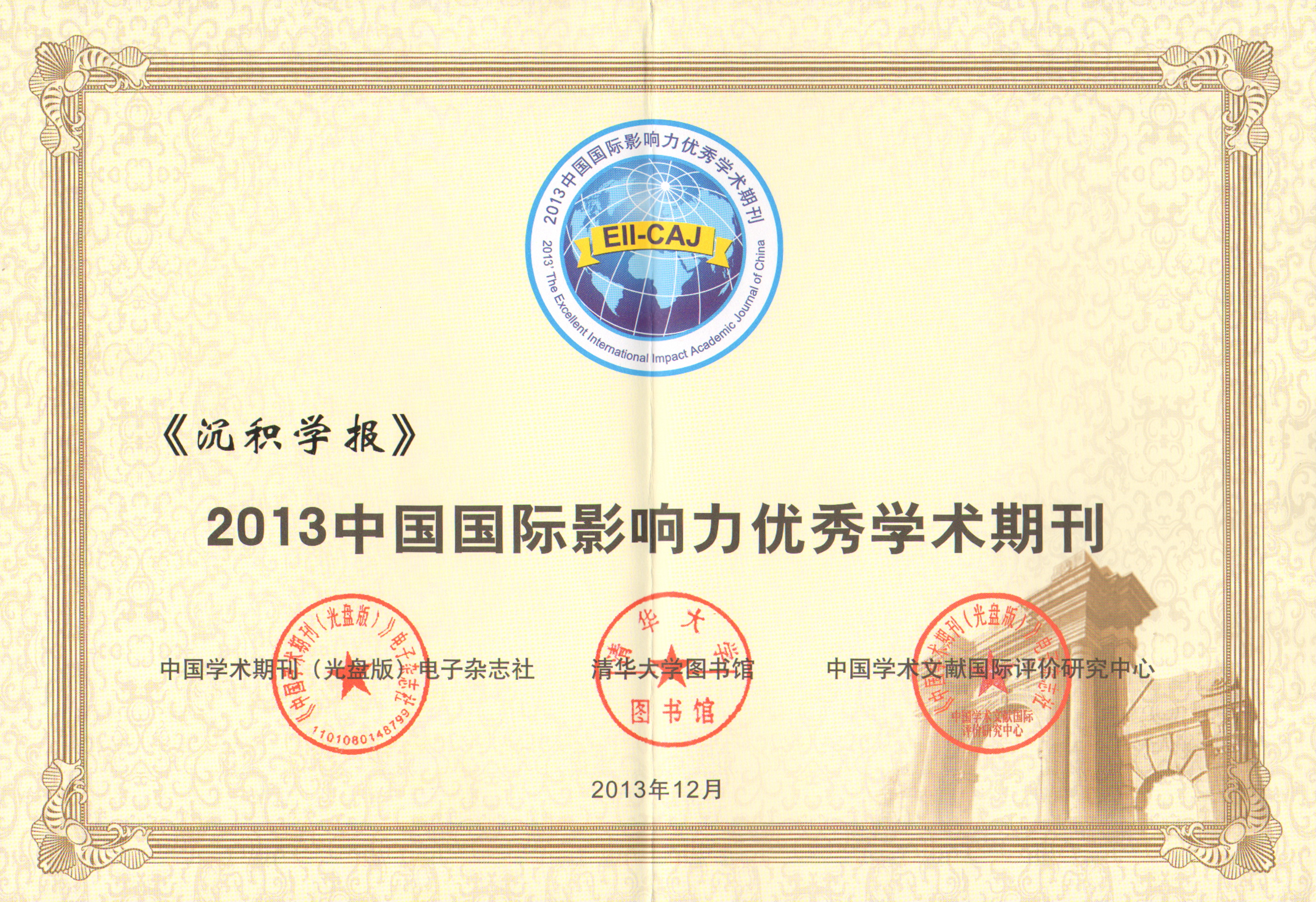 此次《沉积学报》荣获“2013中国国际影响力学术期刊”称号,国际影响力指数CI、国际他引总被引频次、国际他引影响因子等期刊指标名列前茅,已经具备了相当的国际影响,逐步迈进国际期刊门槛。